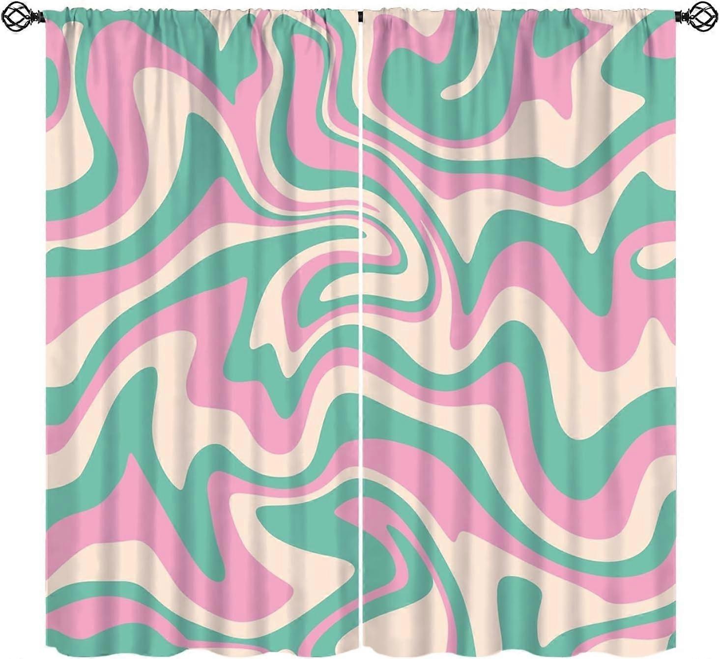 Hippie Aesthetic Curtains, 1970s Wavy Swirl Pink/Green/Beige Print, Rod Pocket Thermal Drapes (2 Panels, 84"x84")