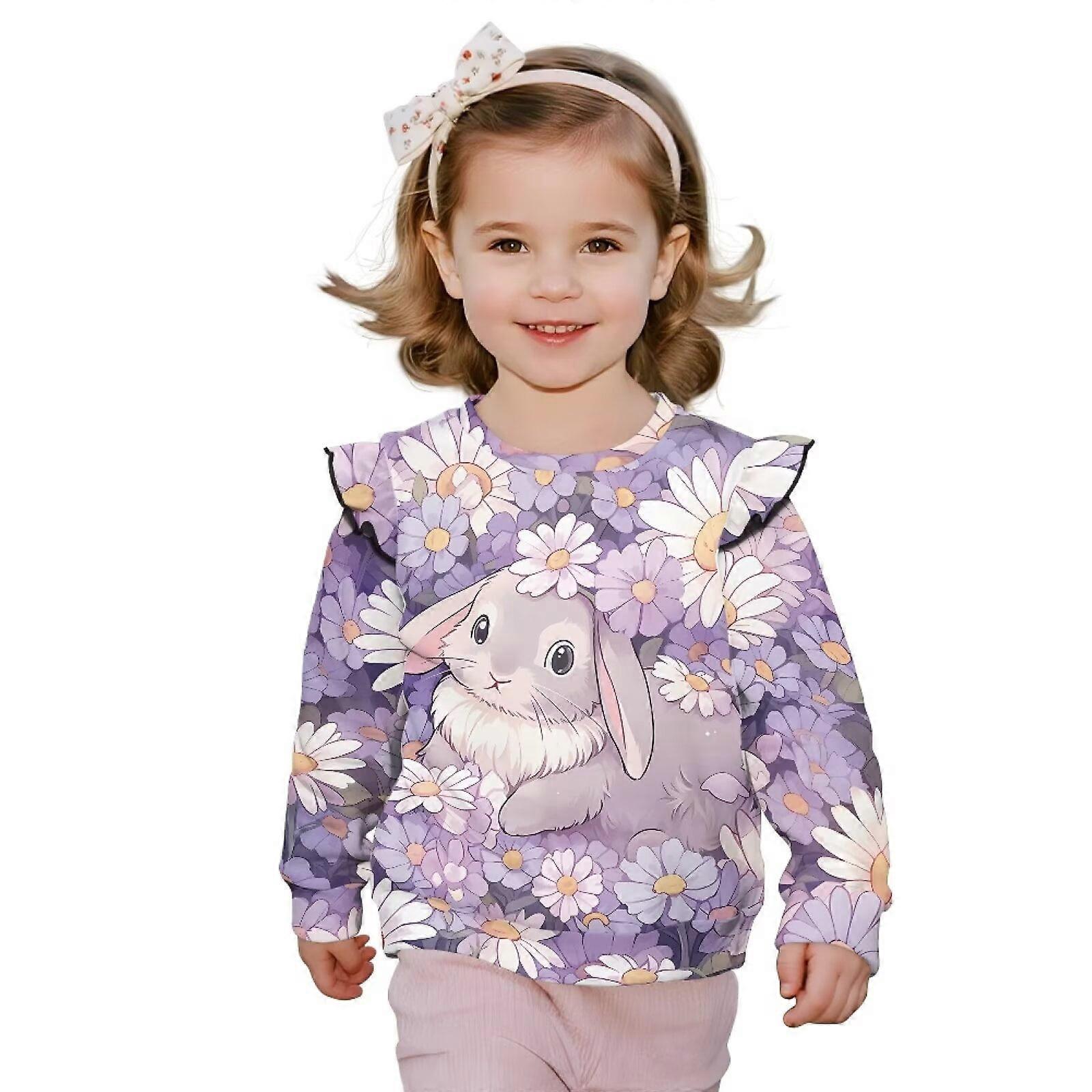 Purple ruffled shoulder sweatshirt for girls, long sleeve crewneck daisy rabbit pullover – comfortable casual sweater, compatible with