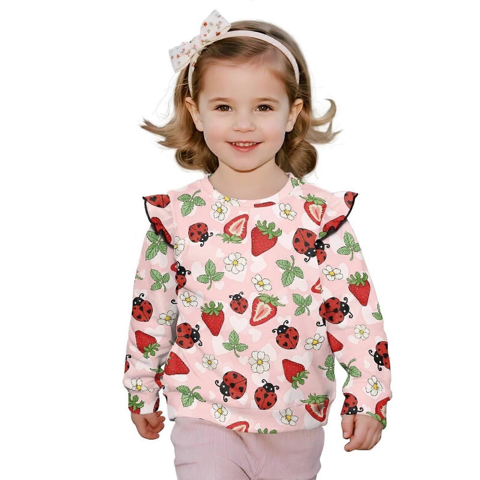 Girls Pullover Sweatshirt Long-Sleeve Crewneck Strawberry Ladybug Sweatshirt for Kids Novelty T-Shirts Sweater with Ruffle Shoulder Fashion Size 2-3