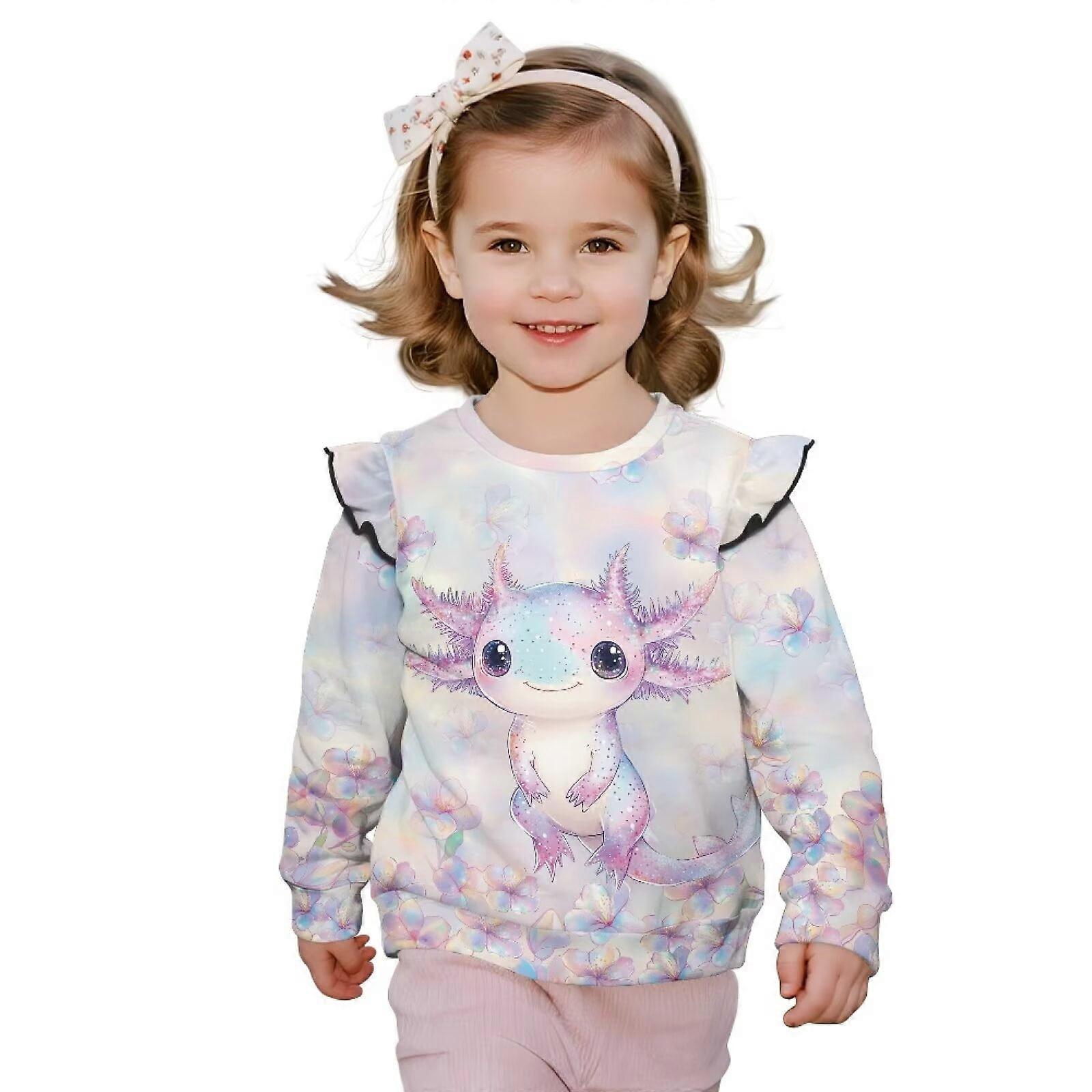 Girls' Axolotl Floral Pullover Sweatshirt, Long-Sleeve Crewneck with Ruffle Shoulder, Size 1-2