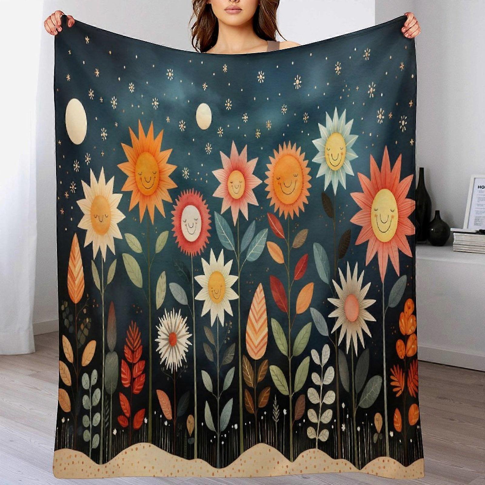 Watercolor Rainbow & Sun Throw Blanket, Fuzzy Cozy Plush Flannel, 50"x60", Abstract Wildflower Design