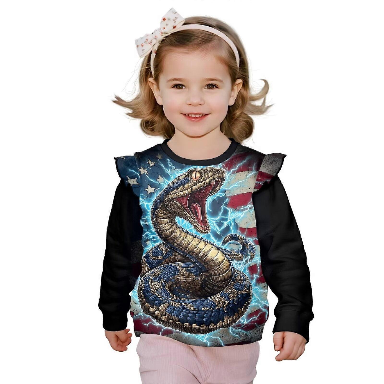 Girls' Ruffle Shoulder Sweatshirt, Long Sleeve Crewneck Pullover for 1-8 Years – Fall School Fashion, Lightning Snake & American Flag Design