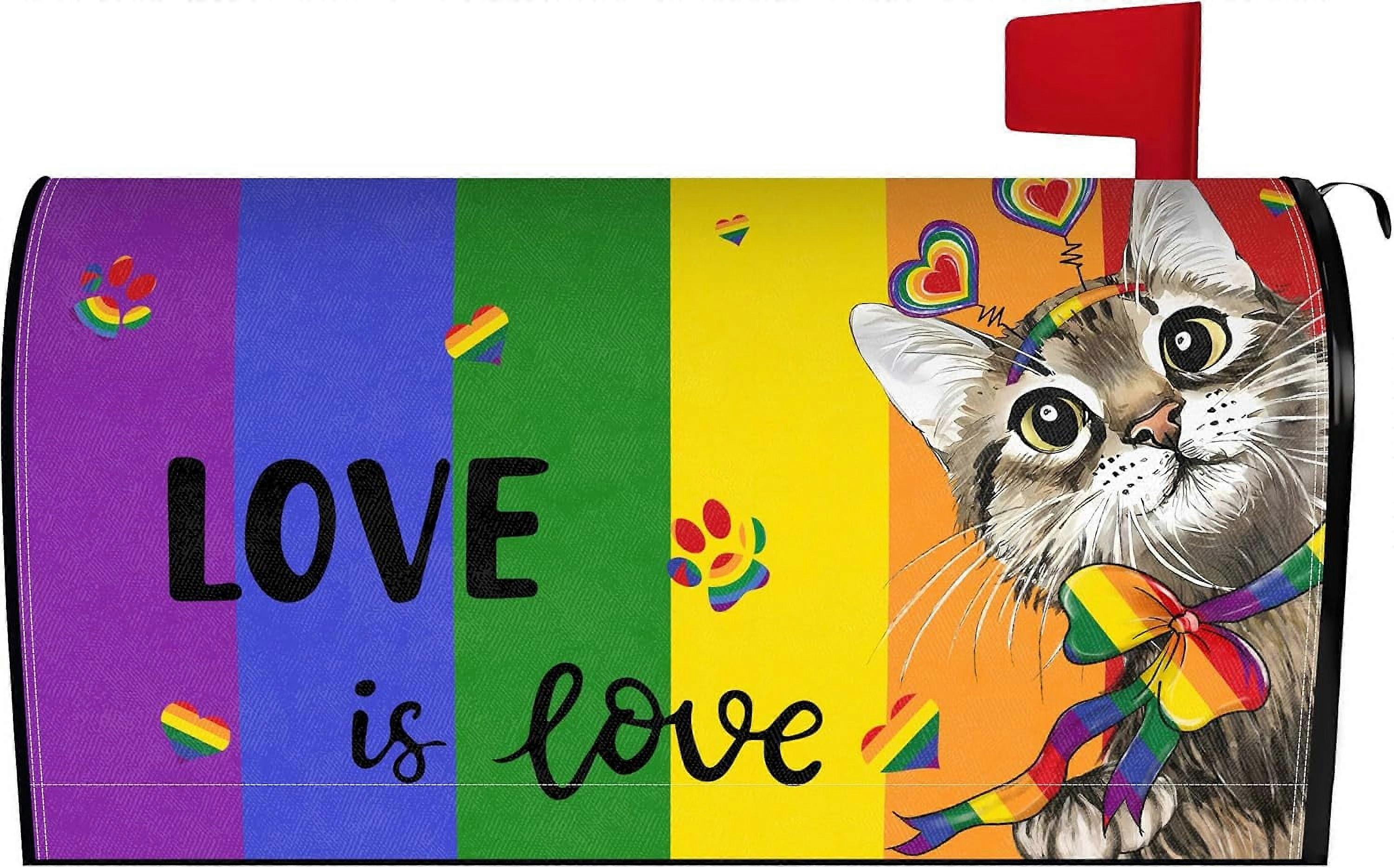 Gay Pride Cat Mailbox Cover 25.5x21", Rainbow "Love is Love" Magnetic Waterproof Wrap, Compatible with Standard Outdoor Mailboxes