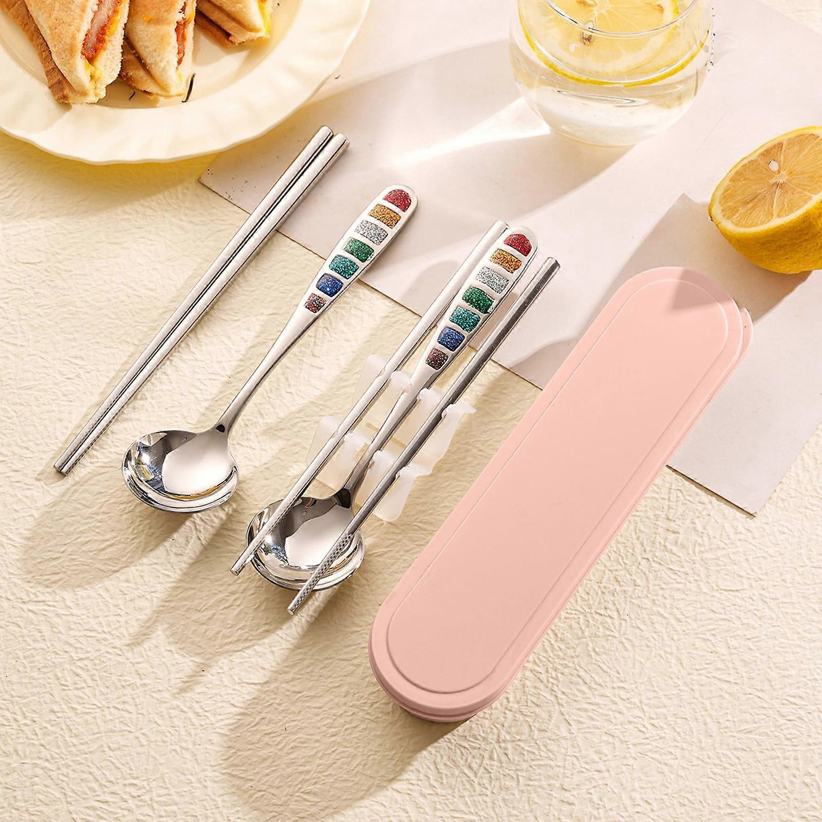 Rainbow Enamel Cutlery Set, 2-Pack Spoon & Chopsticks in Box, Portable Stainless Steel for Camping/Office/Travel, Pink