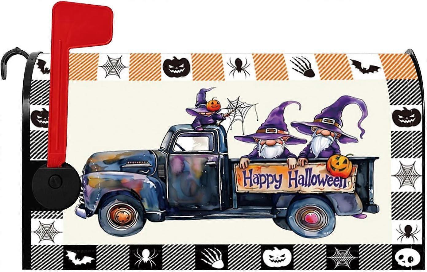 Halloween Mailbox Cover: Gnome in Truck, Striped Pumpkin & Spider Web – Magnetic, 21x18", Compatible with Standard Mailboxes
