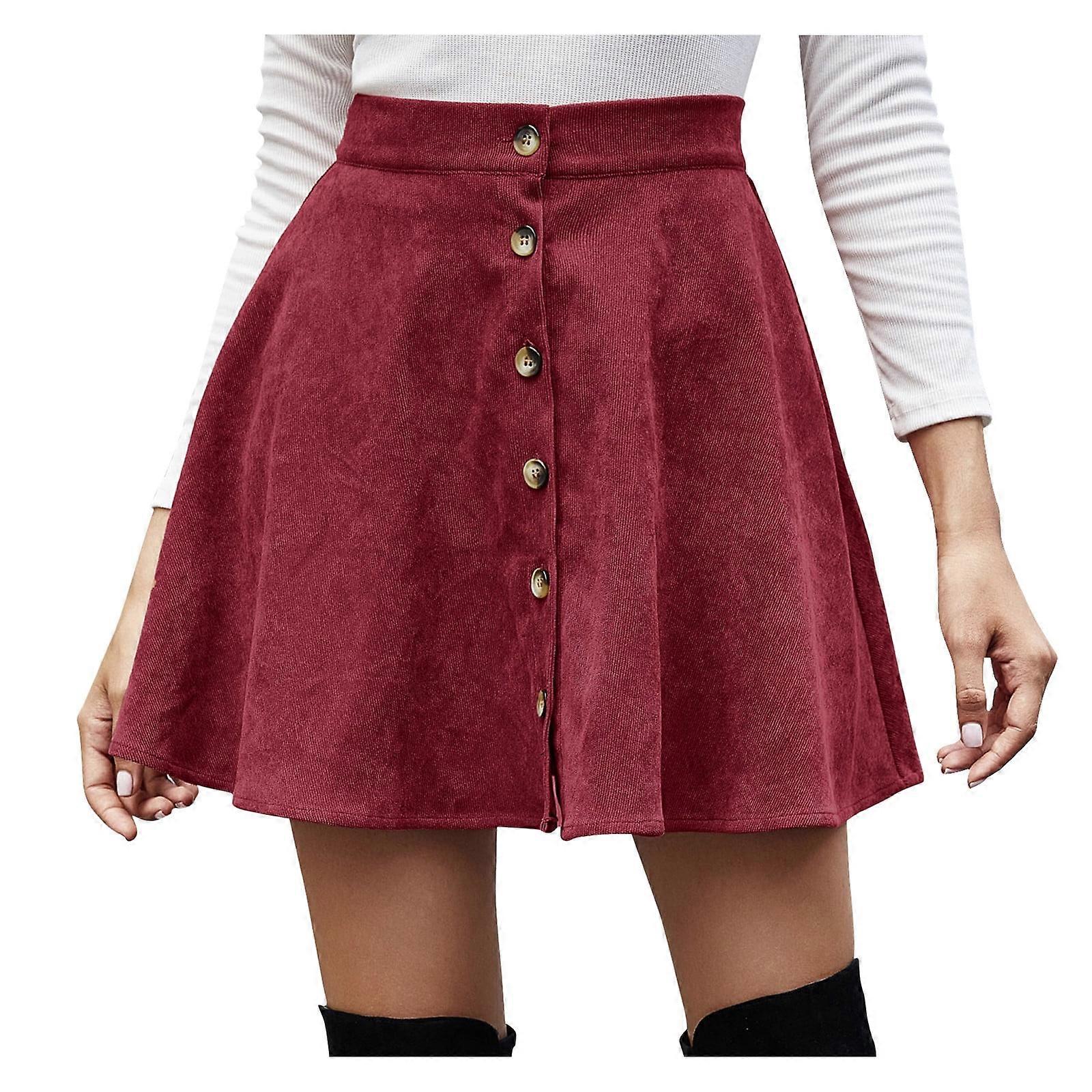Women's Wine Red Corduroy A-Line Midi Skirt, Elastic Waist, Solid Color, Compatible with Casual Outfits