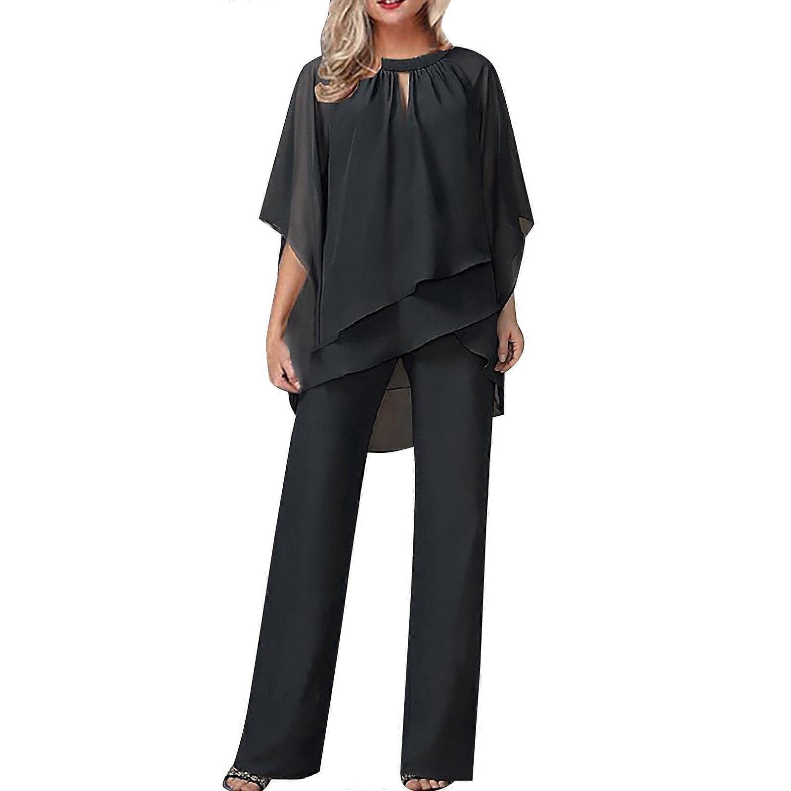 Elegant Ruffle 2 Piece Sets Women's Solid Color Loose Irregular Set Casual Pantsuits with Short Sleeve Chiffon Ruffle Blouse (Black,XXXL)