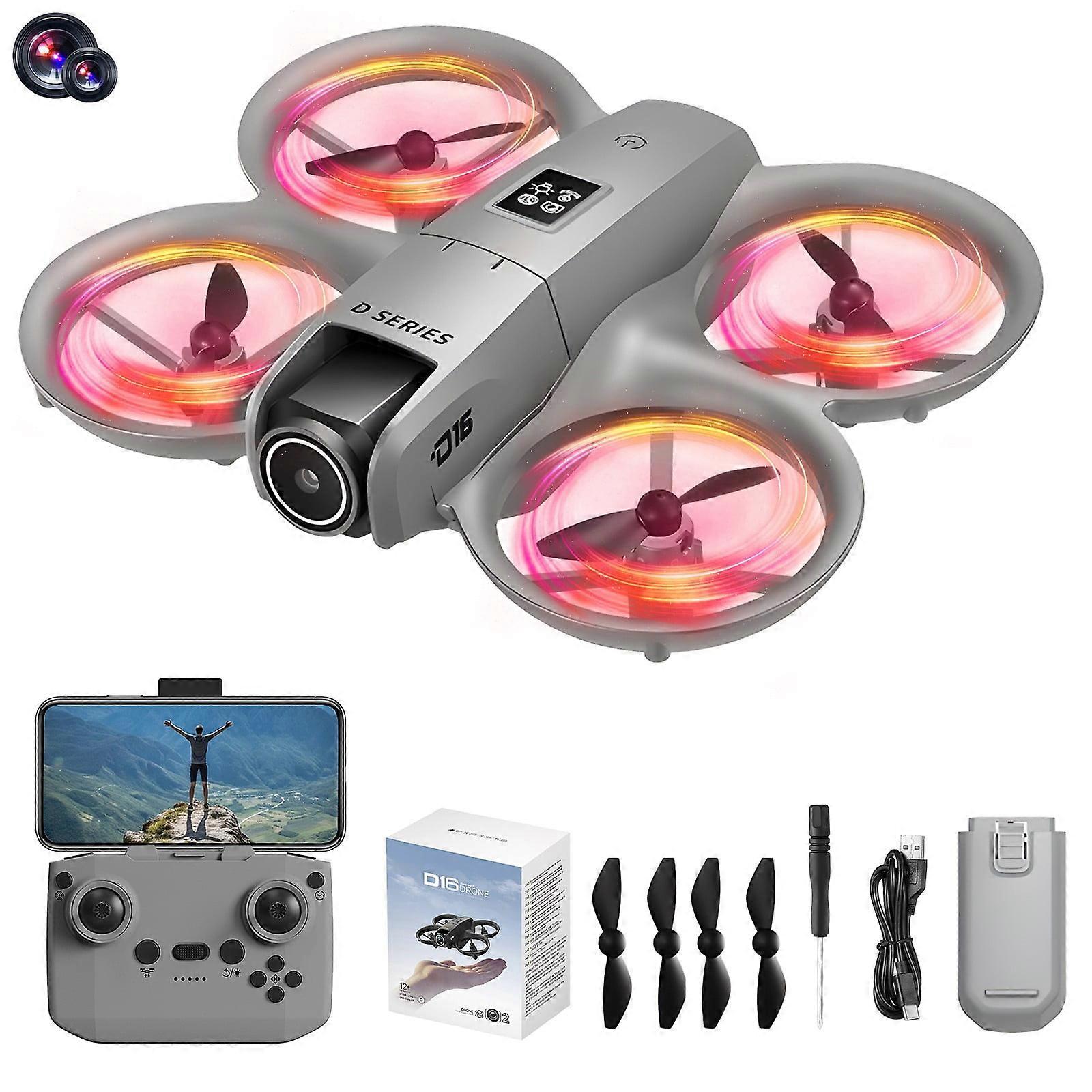 Drone With 180 Degree ESC Camera And Cool Light Remote Control Toys Gifts For Boys With Altitude Hold Headless Mode Start Speed Adjustment Features: 【LIGHT UP THE SKY】The drone's bright LED light radiates a striking neon blue across its entire body, providing you with a powerful illuminating effect and a interesting flight experience. 【Electric adjustable camera】equipped with a remotely adjustable camera, coupled with a mobile app for real- transmission, as well as functions such as take photos and recording videos, making it more playable 【SECURE】The structured style and FOUR sturdy guards ensures a secure flight which protects your kids to avoids body injury from spinning propellers. Good quality ABS material to withstand countless crashes or drop. Equipped with obstacle avoidance function, effectively avoiding obstacles and flying safer. 【User Friendly】You can simply take-off / land the drone with one button. Three speeds for you to choose, No matter beginners or skilled players. You have no worry about identifying directions Under headless mode. The altitude hold feature allows your drone to hover automatically in the sky. (Even if you do not do anything with the controller) All these features make the drone extremely beginner-friendly. 【Multiple Functions to Meet Your Needs】: This drone offers a variety of functions to enhance your flying experience. These include Fly, 3 Speed Gears, Headless Mode, OneKeyTakeoff/Landing, Altitude Hold, 360° Flip, Gesture photography/video recording, trajectory flying, WiFi phone control, lens 90 ° adjustment, one click backwardand Emergency Stop, Light control, obstacle avoidance, sensing control. Product Description: Material:Plastic/Metal/ Electronic components. Color:Gray Frequency:2.4G. Lens Angle: 180° electric adjustable. Channels:4CH. Suitable age:8+. Body Battery:3.7V 580mAh lipo. Charging :60 mins. Flying :9 mins. R/C Distance:262-328 ft. Image Transmission Distance:164ft. Image transmission signal:WiFi. Charging mode:USB charging cable. Speed gear:Fast/Slow. Remote battery:3xAAA(not include) Product size:5.35*4.4*.1.85in/13.6*11.3*4.7cm. Packing size:6.9*5.7*3.6cm/17.5*14.4*9.1in. Product gross weight:315g/0.7lb. Package Contents: Drone x1 Remote control x1 1x accessory kit mini drone drone for kids toys for ages 8-13 drones