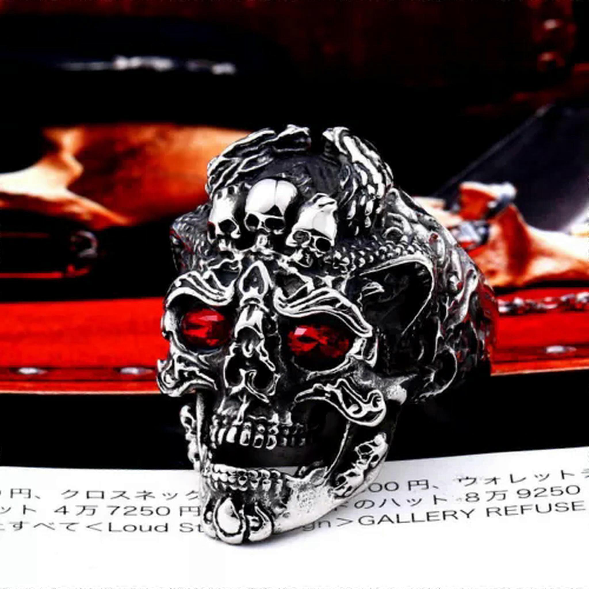 Triple Skull Crown Red CZ Eye Skull King Ring Stainless Steel Gothic Biker Ring-9