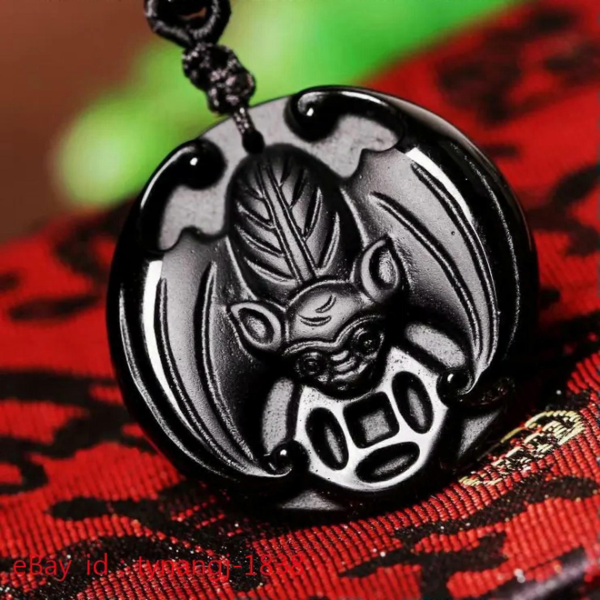 Natural Black Obsidian Pendant Chinese Coin Bat Lucky Necklace Fashion Jewelry-default