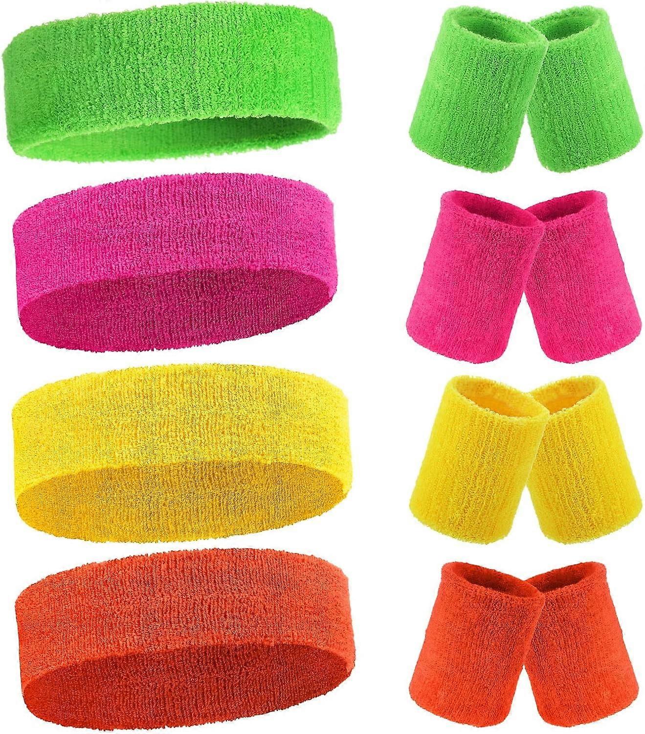 80s/90s Neon Sweatbands Set (8 pcs) – Cotton Terry, Absorbent, Nonslip, Stretchy Wrist & Head Bands for Men/Women – Compatible with Fitness &