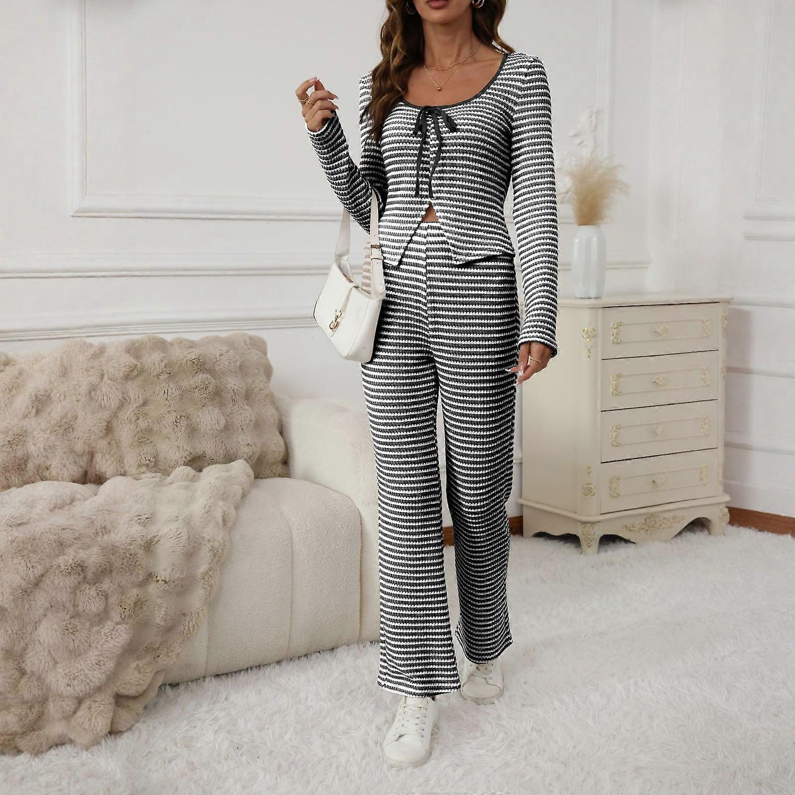 Women's Striped Wide Leg Pants 2-Piece Set Drawstring Ribbed Black M