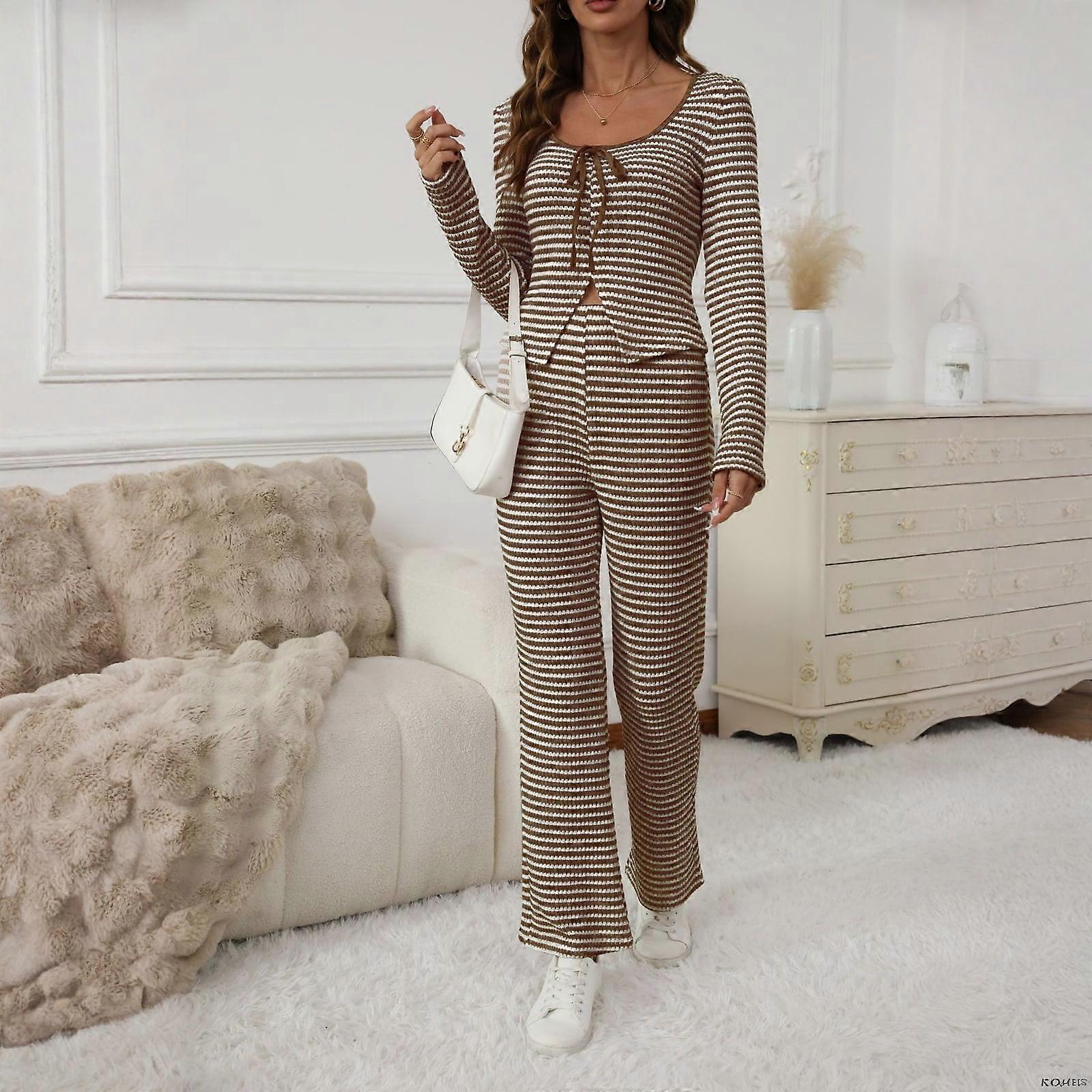 Women's Striped Wide Leg Pants 2-Piece Set Drawstring Ribbed Khaki XL