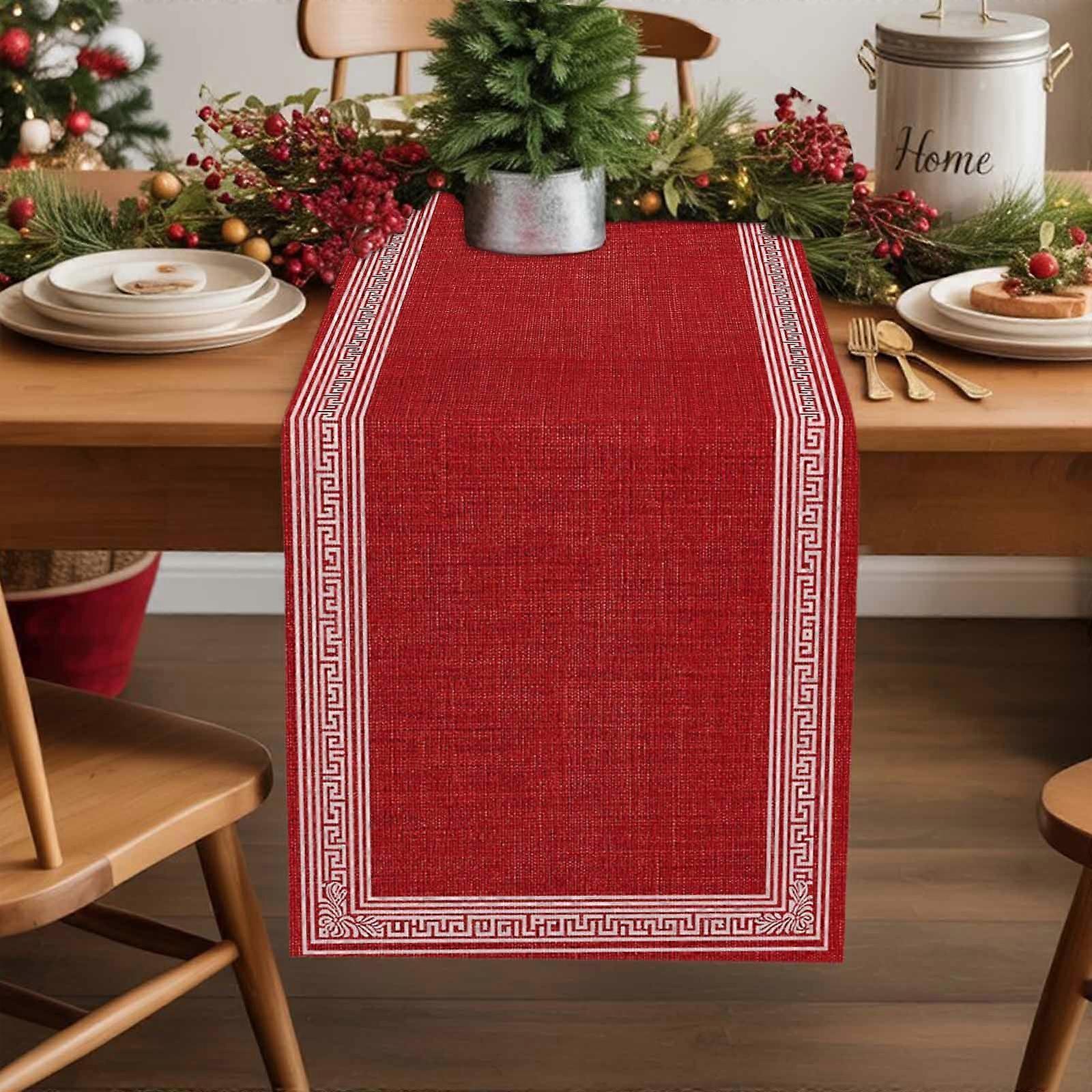Burlap Table Runner 72", Geometric Red Linen, Non-Slip Kitchen & Dining Table Decor, Vintage Ethnic Style