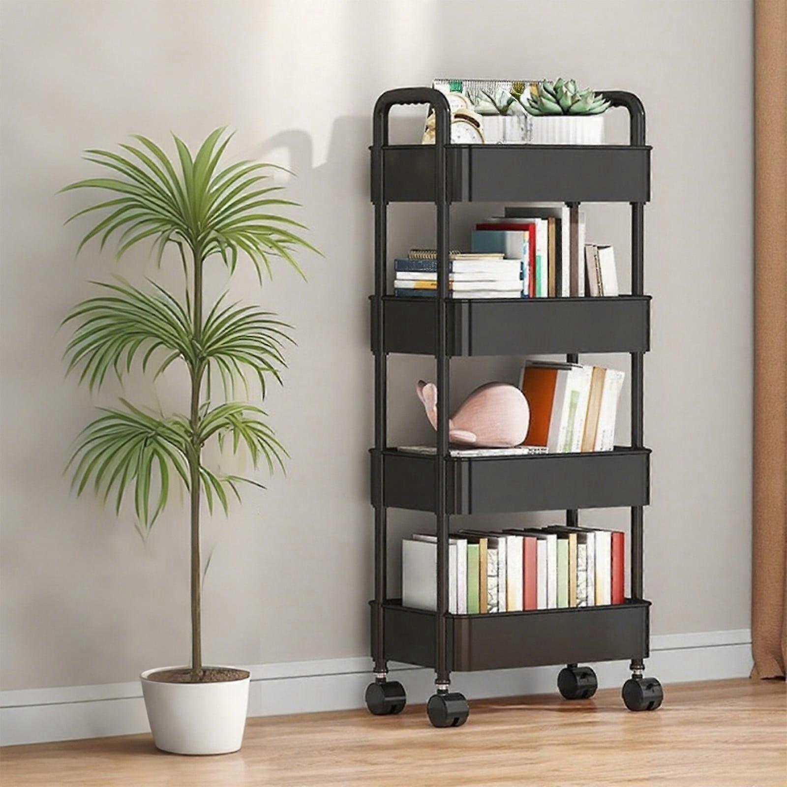 4-Tier Black Rolling Kitchen Cart with Wheels, Multi-Purpose Storage Trolley for Pantry/Living Room/Bathroom | Plastic Mobile Organizer Shelf