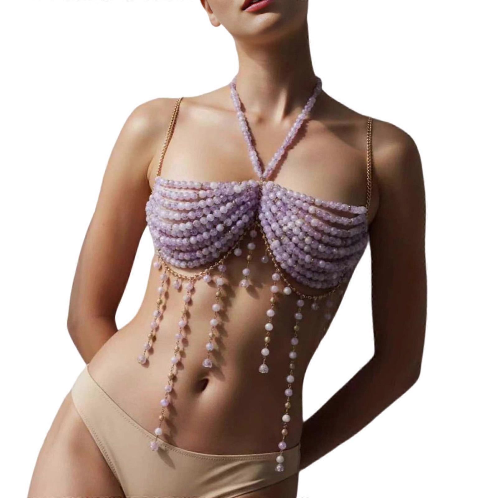 Bohemian Body Chain Bra Beaded Bikinis Chest Chain Necklace Raves Nightclub Body Accessories Jewelry Gifts for Women Purple os