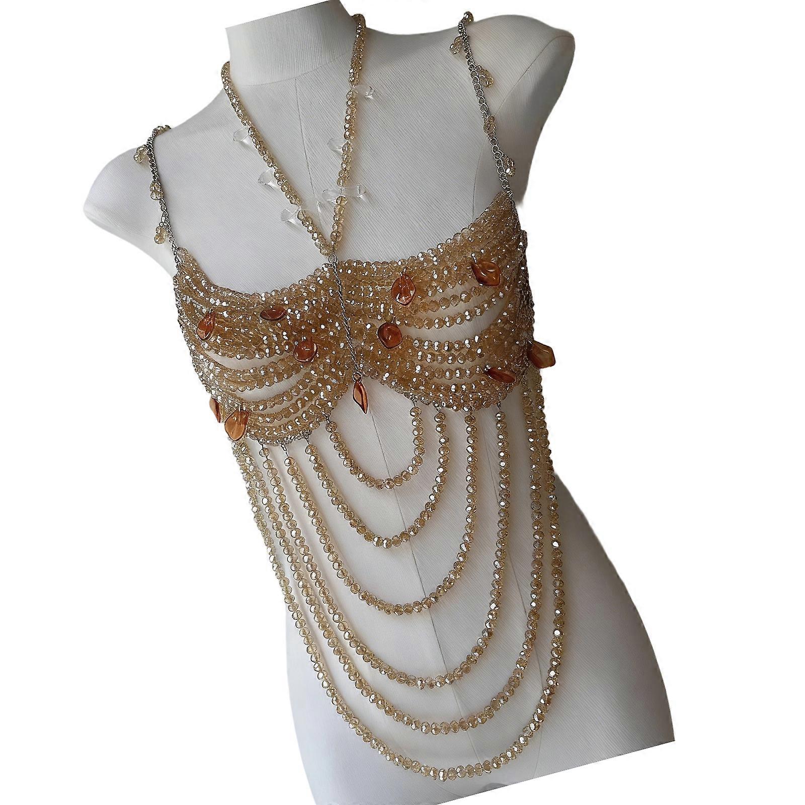 Beaded Body Chain Bra Multilayer Body Chain Harness Body Jewelry Accessories Beach Bikinis Coverup for Womens Girls champagne os