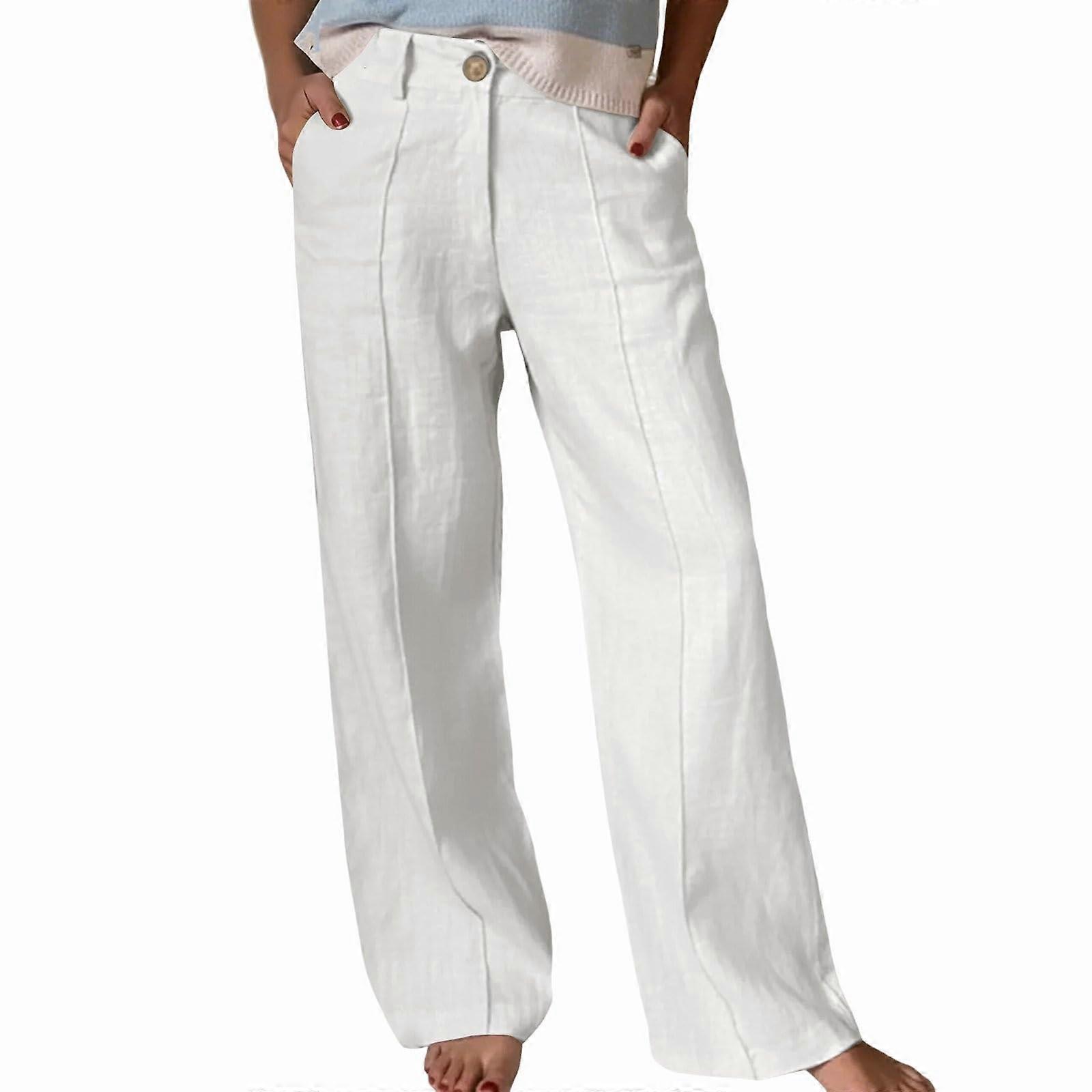 Women's cotton and linen wide-leg pants, button-down front, yoga pants, lightweight beach casual pants. White XL