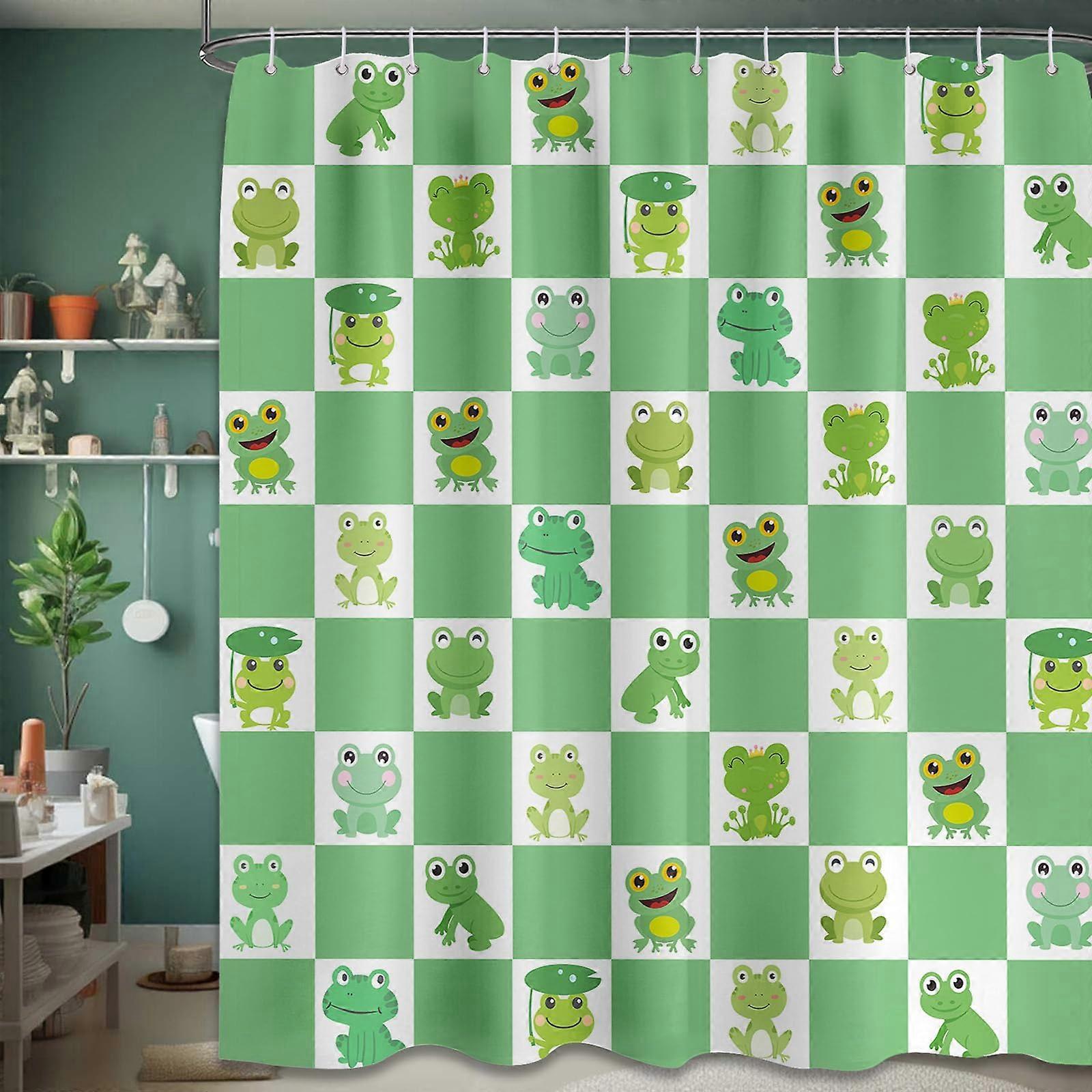 Frog Shower Curtain 70x96 Inch, Cute Green Checkered Waterproof Fabric with Hooks, Kawaii Bathroom Decor for Kids