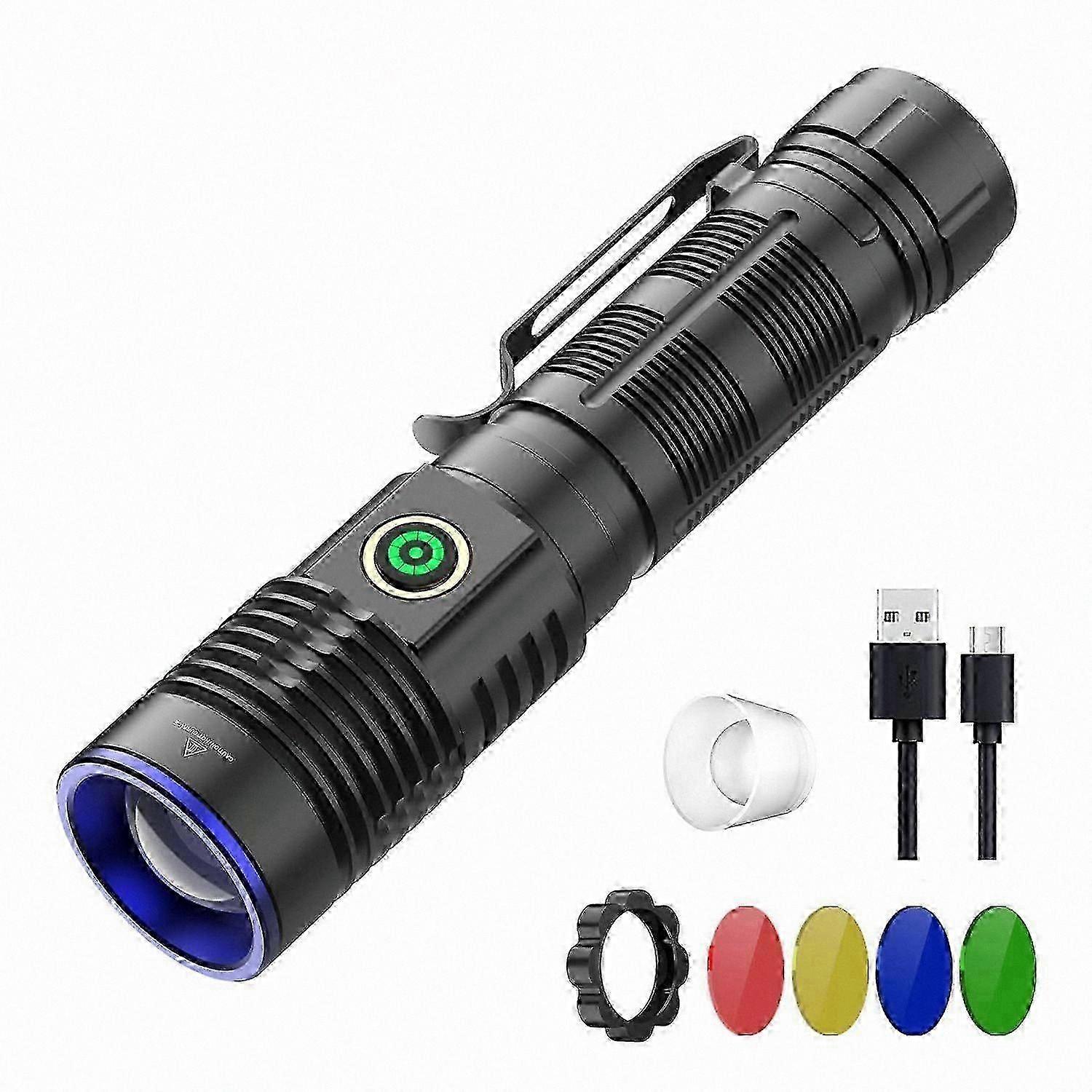 5-in-1 Multicolor LED Tactical Flashlight, Rechargeable High Lumens Zoomable with White Red Green Blue Yellow Lenses, 4 Modes