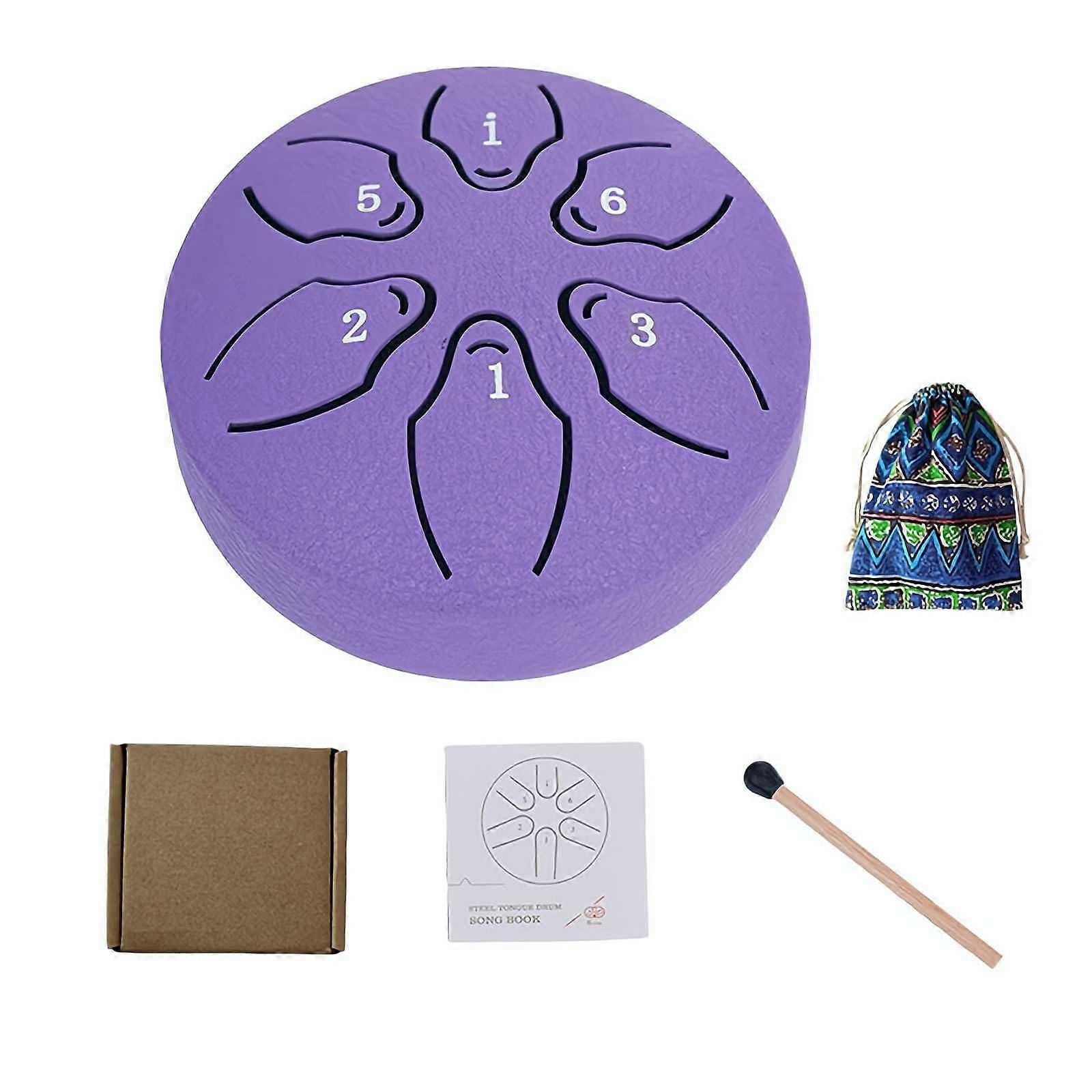 Color: Purple Product overview A compact 6tone steel tongue drum engineered for clear, resonant notes and simple playability. Made from grade carbon steel, this 7.9 cm 3 in instrument delivers six tuned notes in a single scale. The weatherresistant finish and decorative panda druminspired design make it suitable as both a musical instrument and an outdoor accent. Key benefits Pure, resonant sound: Six tuned tongues produce clear, sustained tones that work well for ambient music, meditation, and creative practice. Easy to play: Play by hand or use the included mallets. The intuitive layout makes it accessible for beginners, children, and seniors. Compact and durable: Small footprint (7.9 cm 3 in) and constructed from carbon steel with a weatherresistant finish for outdoor or indoor use. Dual purpose: Functions as a musical instrument and decorative piece for patios, balconies, gardens, or indoor displays. Ready to use: Includes mallets so you can start playing immediately. Features and specifications Color: Purple Material: grade carbon steel Notes: 6 tones in a single scale Size: 7.9 cm 3 in diameter Play options: Hands or mallets (mallets included) Design: Panda druminspired decorative styling Intended use: Indoor and outdoor settings; compact enough for small spaces Practical use scenarios Evening outdoor ambiance: Place on a patio or balcony and play soft patterns to create a pleasant background atmosphere while entertaining or relaxing. practice: Use during meditation, yoga, or focused listening sessions to support a calm, measured practice. Group or education setting: Ideal for simple rhythm and melody exercises in group music classes, workshops, or family playtime. What makes it stand out A balance of musical quality, simple playability, and compact, weatherresistant design. The 6tone tuning and carbon steel construction provide reliable tonal clarity while the portable size and included mallets make it easy to take outdoors or move between rooms. Contents 1 purple 6tone steel tongue drum (7.9 cm 3 in) 2 mallets Care and handling Wipe clean with a soft, dry cloth. Store indoors when not in use for extended periods to maximize finish longevity.