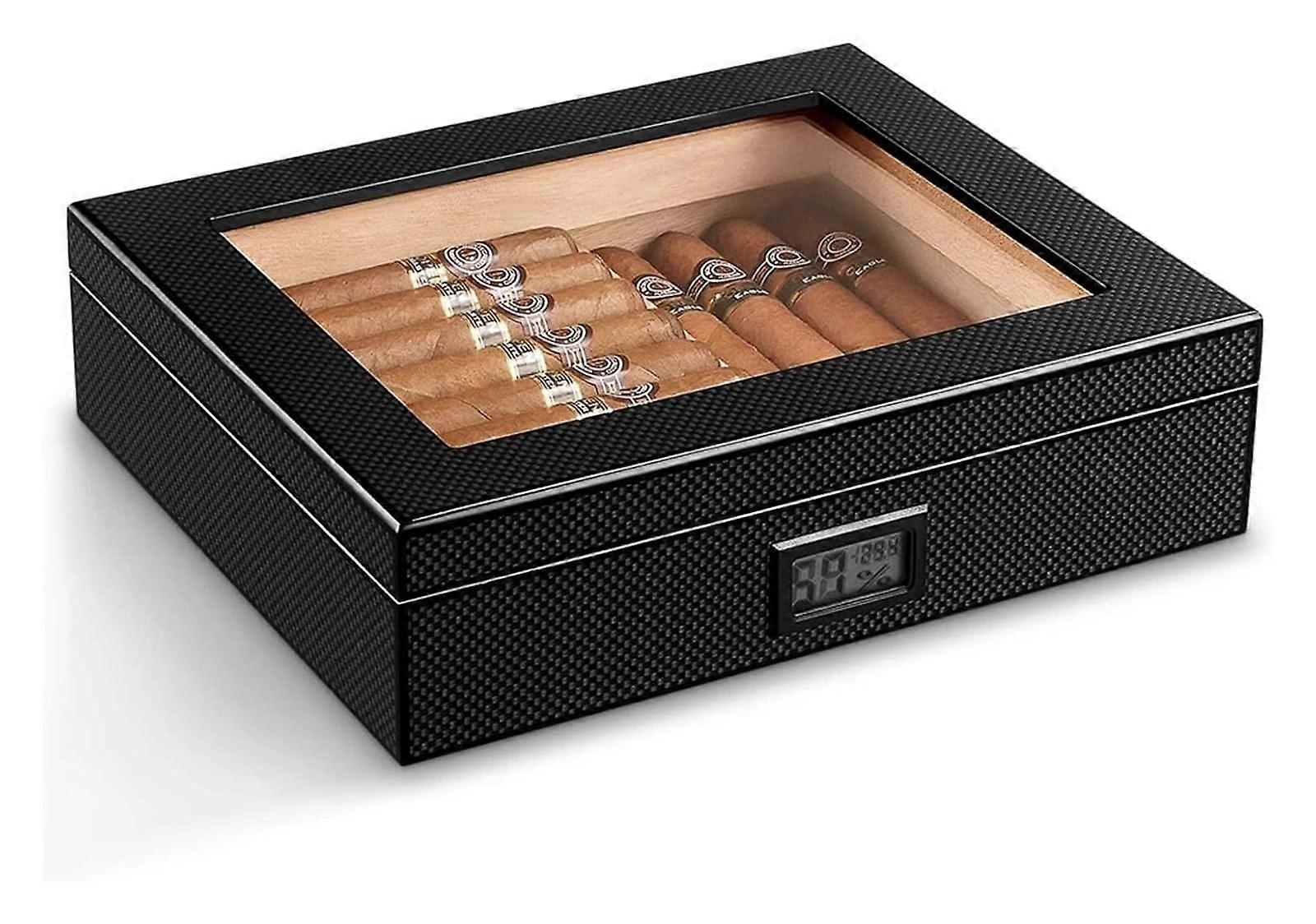 Carbon Fiber Travel Cigar Humidor with Cedar Wood Interior, Builtin Hygrometer and Humidifier