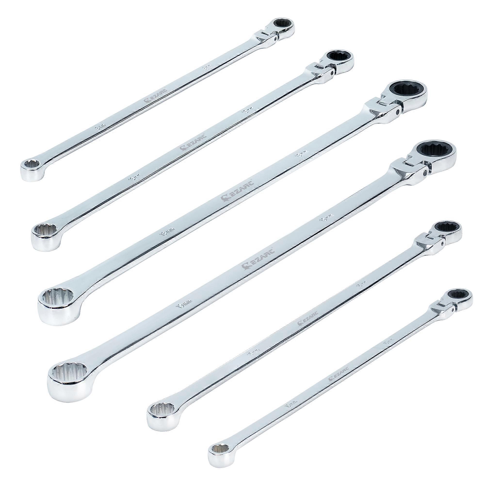 EZARC 6PCS Premium 12-Point Socket Wrench – Durable / Versatile Why Choose EZARC Wrench Set? / Professional-Grade Durability – Built for mechanics, DIYers, and industrial use. / Ergonomic Design – Comfortable grip and optimized leverage reduce hand fatigue. / Multi-Purpose Use – Ideal for automotive repair, machinery, and home maintenance. 📦 Package Includes: 6 x Metric One-side Ratchet Adjustable Wrench. 💡 Tip: For best results, pair with impact-rated sockets for heavy-duty applications. Item Features: 🔧 Secure 12-Point Grip Firm Hold, No Slipping: The unique 12-point design ensures a tighter grip on fasteners, reducing slippage for safer, more efficient use. ⚙️ High-Strength Chrome Vanadium Steel Ultra-Durable / Wear-Resistant: Made from premium chrome vanadium steel, this wrench delivers exceptional hardness and long-lasting performance, even under heavy use. 🔄 180° Swivel Head for Tight Spaces Flexible / Adaptable: The single-sided swivel head rotates 180 degrees, allowing access to hard-to-reach bolts in confined or awkward spaces. 🔨 Extended Handle for Maximum Leverage Effortless Torque Application: The elongated handle provides better leverage, reducing user effort while increasing tightening/loosening power. 🛡️ Rust-Resistant Electroplated Finish Corrosion Protection / Sleek Look: The electroplated coating prevents rust and maintains a polished appearance over time.