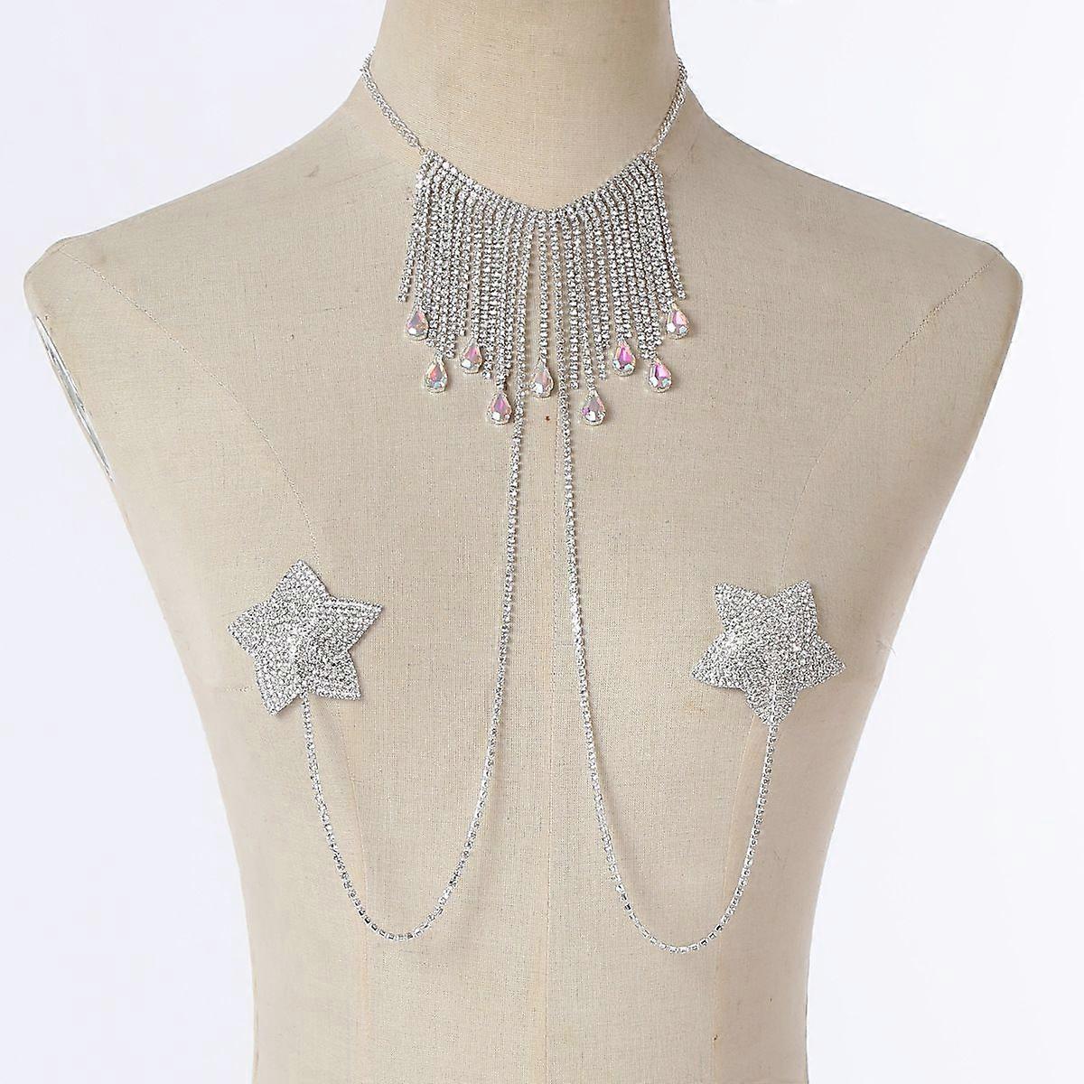 2026 new chest support jewelry fashion shiny rhinestone five-pointed star tassel chain hanging neck necklace chest chain silver