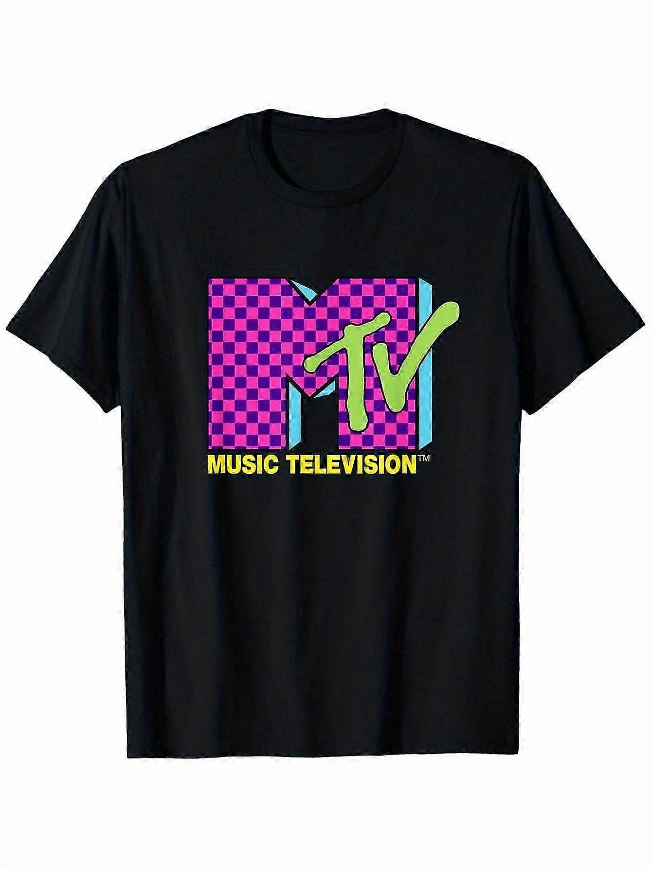 Men's Retro 80s Neon Pink Checkerboard Mtv Logo T-shirt - 100% Cotton Casual Fit Short Sleeve Tee, Machine Washable, Siz-avdwq GZDGV