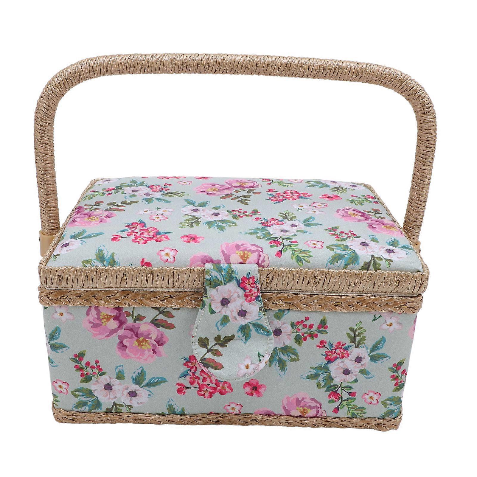 Large Sewing Basket Fabric Organizer with Pink Flower Design, Crafting Tools Storage Box, Mending Supplies Holder Green Bottom