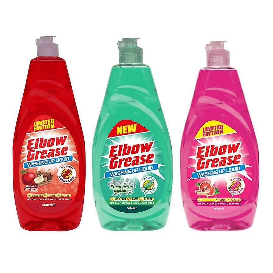 3 X Elbow Grease Washing Up Liquids 600ml: Apple & Cinnamon, Eucalyptus, Pink Blush