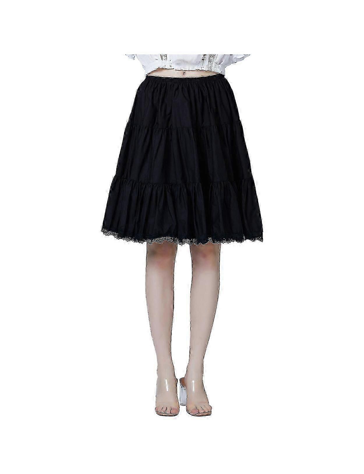 ANTI-STATIC COTTON --- This half slip is made from cotton, the advantage is sweat and moisture absorption, non-stick and anti-static, comfortable and breathable. Cotton cloth is slightly thick and durable, not flimsy and not see through.FULL CIRCLE & A-LINE --- The hem circumference of the under slip is 4.6m creating a classic full circle look. The bottom of the cotton full skirt is decorated with lace trim, so the A-line skirt is very free and feminine, which is very suitable for medium-sized or slightly chubby women.COMFORTABLE WAISTBAND --- The elasticated pleats are not too dense so they stretch easily and do not feel tight. Good elastic fit on the waist to wear it high or low. Please choose your size according to the size chart in our pictures.AS AN UNDERSKIRT --- A cotton petticoat can be used under a flowing sheer or shorter outer skirt, looks great with the lace peeping out from under a dress or skirt. It's better to use under those 50s full skirts or flared skirts that don't want to be too puffed out but needed some shape. And add thickness and warmth to those skirts which feel quite thin in winter.AS A NORMAL SKIRT --- The flared skirt is thicker and opaque and can be used on its own. Available in ivory, black, navy blue colors and mini, midi, maxi lengths, it can be paired with any top for spring, summer and fall.