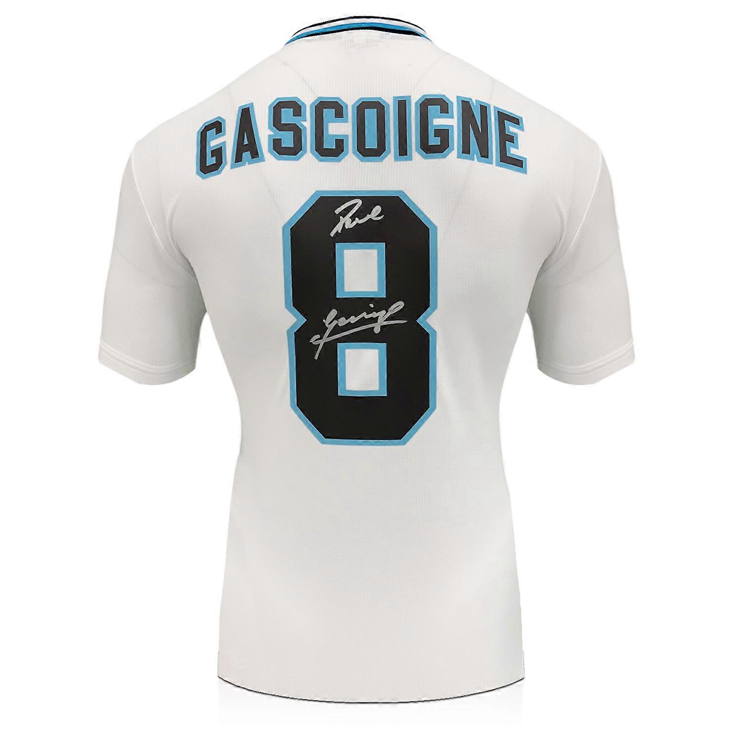 Official replica England 1996 home shirt, signed by Paul Gascoigne. / This England football shirt was personally signed by Paul Gascoigne in Exeter on March 18th 2026. This style shirt was worn by Gascogne when England made it to the EURO 1996 semi-finals, bowing out to Germany in a penalty shoot-out. The team put on an incredible performance during the tournament, with highlights coming from Gazza's incredible goal against Scotland and his iconic "Dentist Chair" celebration. All signatures are originals they are never printed. The product image is a stock photo so the position of signatures might vary slightly. Exclusive Memorabilia unconditionally guarantees all signed items are genuine. The item will come with a certificate of authenticity featuring a numbered hologram that matches an identical hologram affixed to the product. Exclusive Memorabilia is the UK's most trusted brand of sports and entertainment memorabilia, supplying Premiership football clubs, leading cruise lines and charities with their memorabilia for sale and auction.