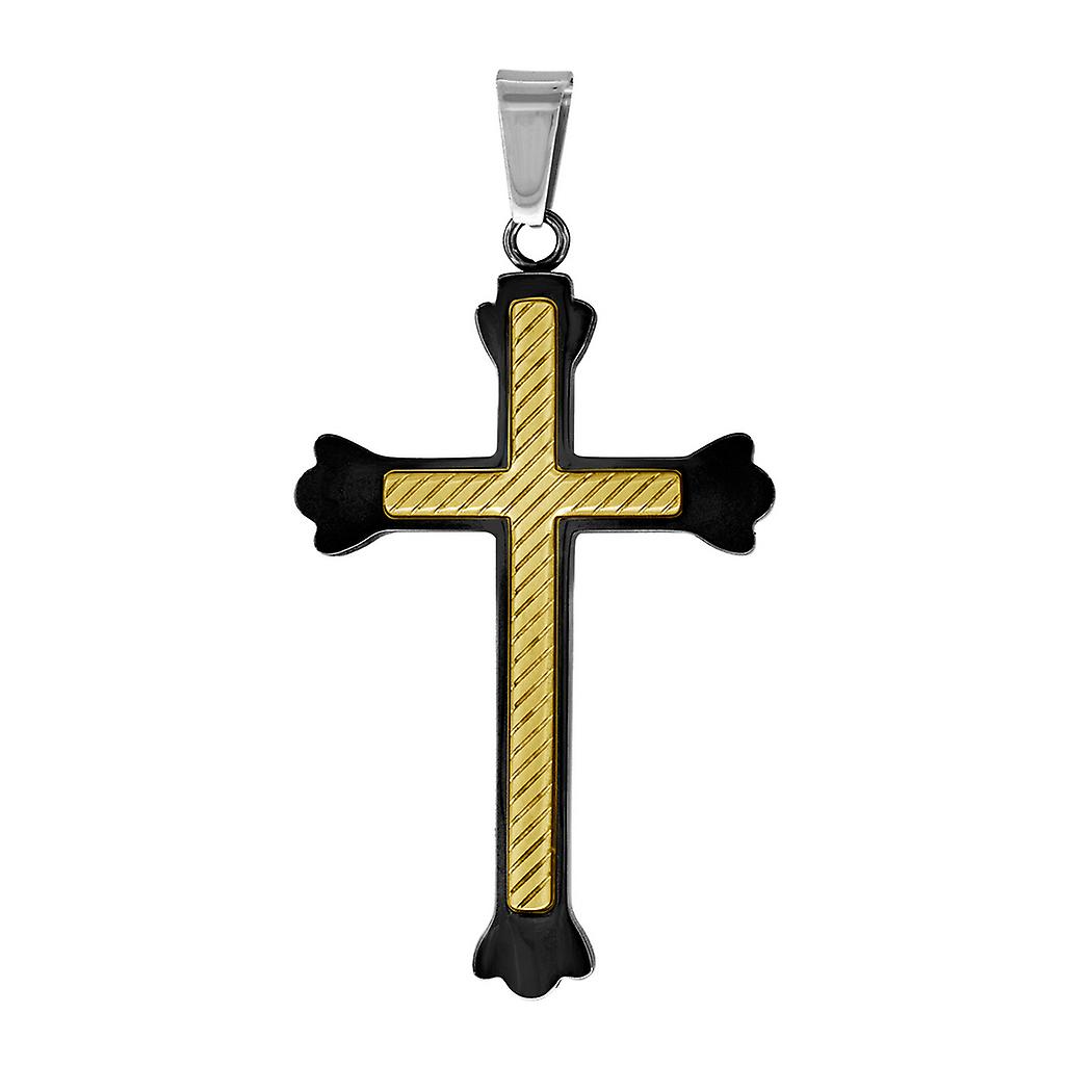 Stainless Steel Mens Black Yellow-tone Center Budded Cross Religious Charm Pendant 32mm W Necklace for Men