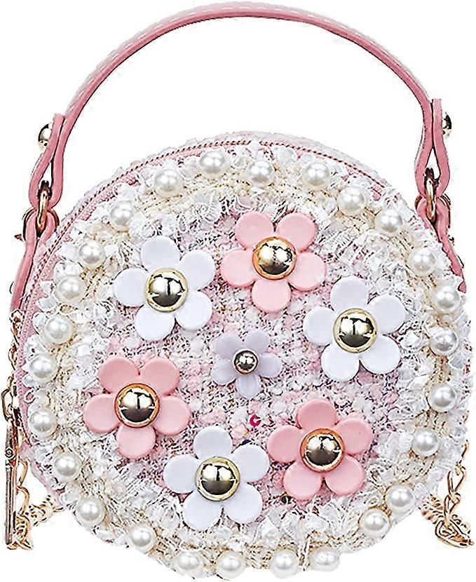 Kongqtee Kids Mini Crossbody Bag Pearl Flower Handbags Cute Round Bag for Little Girl Lovely Shoulder Bag for Toddler Princess Purse Bag with Chain Pi