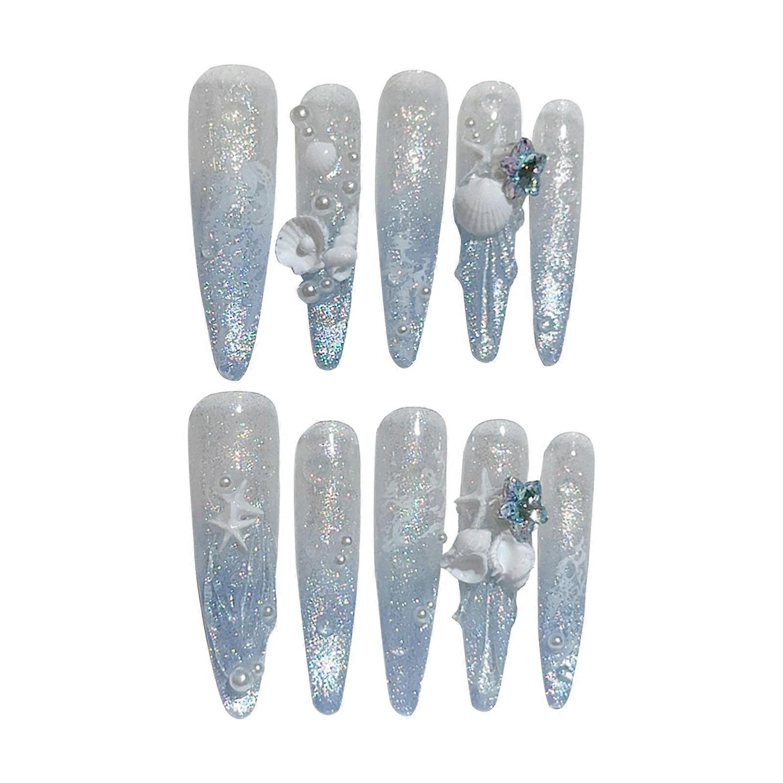 Features: Premium Quality: This 10pcs Press on Fake Nails Kit features high-quality full cover artificial nails with a glossy finish, designed for a natural and durable look, perfect for DIY at-home manicure or salon use. Stunning Designs: Enjoy 10 unique artificial nail art tips with eye-catching styles like Shiny 3D Starfish, Blue Sea Pearl Cat Eye, and Glitter Long Pointed designs, offering trendy options for women and girls. Easy Application: The press-on nails kit includes everything needed for a quick and hassle-free manicure, allowing you to achieve salon-quality results at home without glue or tools. Versatile Use: Ideal for DIY nail design art, these false nails are perfect for special occasions, daily wear, or creative nail art projects, providing a stylish and long-lasting manicure. Comfortable Fit: Each set of 10pcs full cover artificial nails is carefully shaped to ensure a secure and comfortable fit, making them suitable for various nail sizes and preferences. Specification: Material: Resin Size,Thumb(mm),Index Finger(mm),Middle Finger(mm),The Fourth Finger(mm),Little Finger(mm) XS,14,10,11,10,7 S,15,11,12,11,8 M,16,12,13,12,9 Notes: 1. The real color of the item may be slightly different from the pictures shown on website caused by many factors such as brightness of your monitor and light brightness. 2. Please allow slight manual measurement deviation for the data. Include: 10pcs x Press on Fake Nails Kit 1 x Nail File 1 Set x Jelly Glue