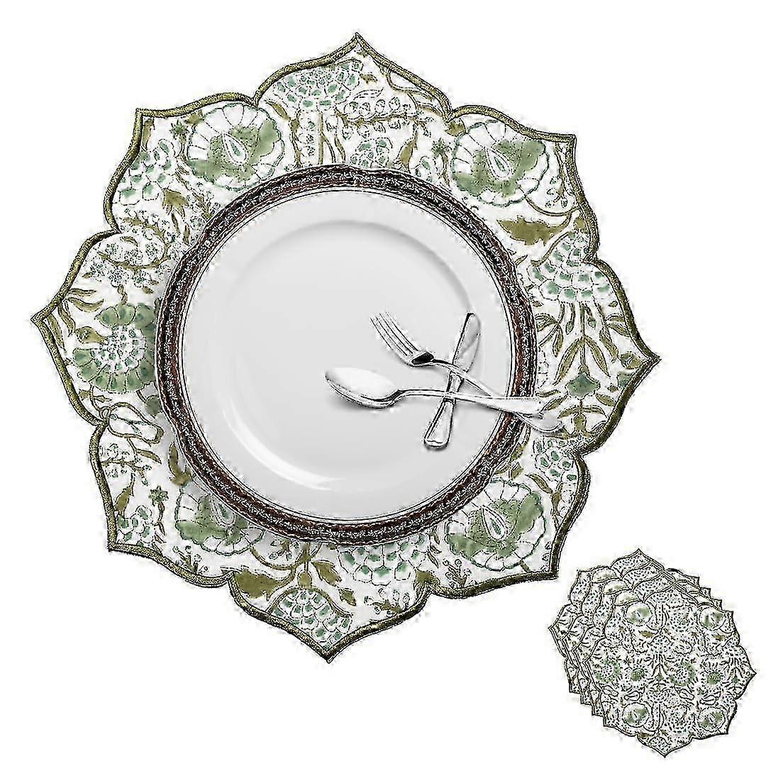 4 Set Cotton Hand Block Printed Machine Washable Floral Scalloped Placemats 15 x 15 Inches
