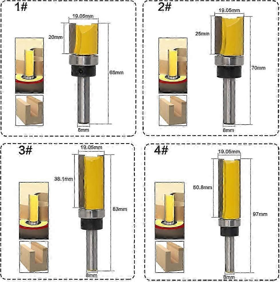 4pcs 8mm Shank Trim Pattern Router Bits Set Template Trim Router Bits Flush Finish Pattern Router Woodworking Milling Cutter Tool 20mm, 25mm, 38mm, 50