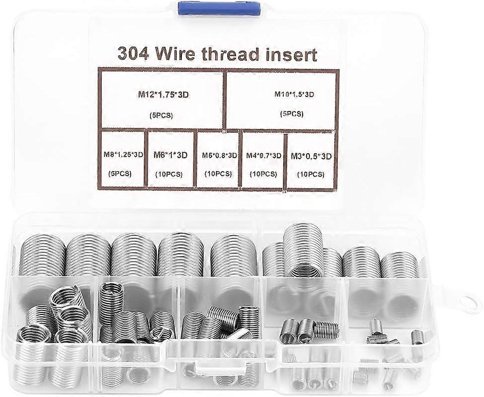 Product Dimensions:12 x 6 x 2 cm; 150 Grams Exterior:Aluminum,Stainless Steel Item Weight:150 g Specification: Material: Stainless steel 304 Size (inner diameter*installed pitch*installed length) & Quantity: M12*1.75*3D (5PCS) M10*1.5*3D (5PCS) M8*1.25*3D (5PCS) M6*1*3D (10PCS) M5*0.8*3D (10PCS) M4*0.7*3D (10PCS) M3*0.5*3D (10PCS) Weight: 146g / 5.1oz (approx.) Note: Installed length= 3D means 3 x diameter, for example, M4*0.7*3D has installed length = 3D = 3 x 4 = 12mm. About this item It can prevent screw from getting loose,especially used for products requiring high coefficient of insurance. Used for parts that requires frequent removing, it can greatly improve service life and wear-resistance of screw thread. Because of a certain elasticity, thread insert can even the load distribution on each thread, eliminate pitch and tooth deviation between screw and screw hole, and absorb vibration, thus increasing the screw thread connection strength and fatigue resista Steel thread inserts used in low strength materials such as aluminum, magnesium, can avoid thread damage and get a good connection performance, to enhance connection strength and improve connection condition. Easy to maintenance, install a thread insert into a damage screw hole, then the screw hole can be used as normal, in order to avoid workpiece loss. See more product details It can prevent screw from getting loose,especially used for products requiring high coefficient of insurance. Used for parts that requires frequent removing, it can greatly improve service life and wear-resistance of screw thread. Because of a certain elasticity, thread insert can even the load distribution on each thread, eliminate pitch and tooth deviation between screw and screw hole, and absorb vibration, thus increasing the screw thread connection strength and fatigue resista Steel thread inserts used in low strength materials such as aluminum, magnesium, can avoid thread damage and get a good connection performance, to enhance connection strength and improve connection condition. Easy to maintenance, install a thread insert into a damage screw hole, then the screw hole can be used as normal, in order to avoid workpiece loss.