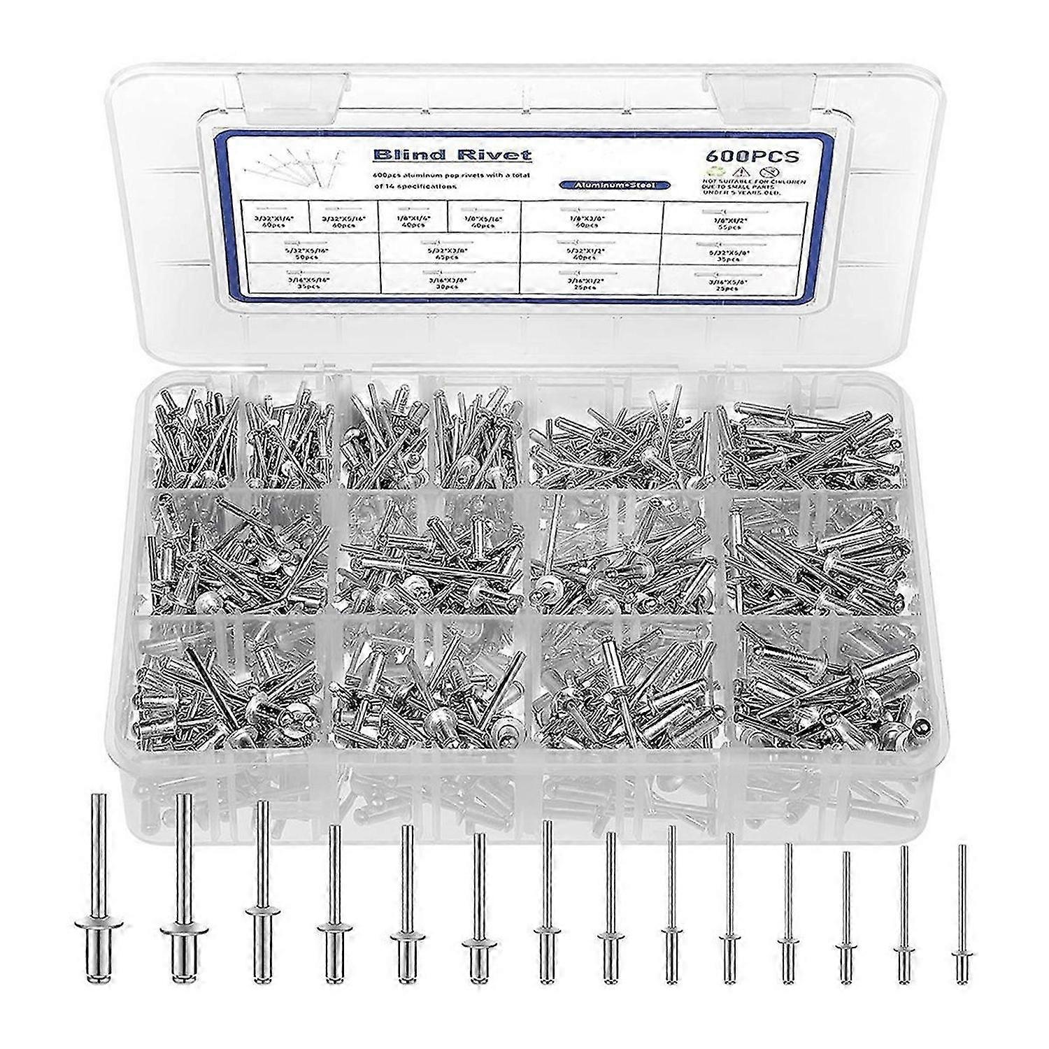 600 Pcs 14 Size Rivets Assortment Kit Aluminum Rivets (3/32 Inch 1/8 Inch 5/32 Inch 3/16 Inch),Assor