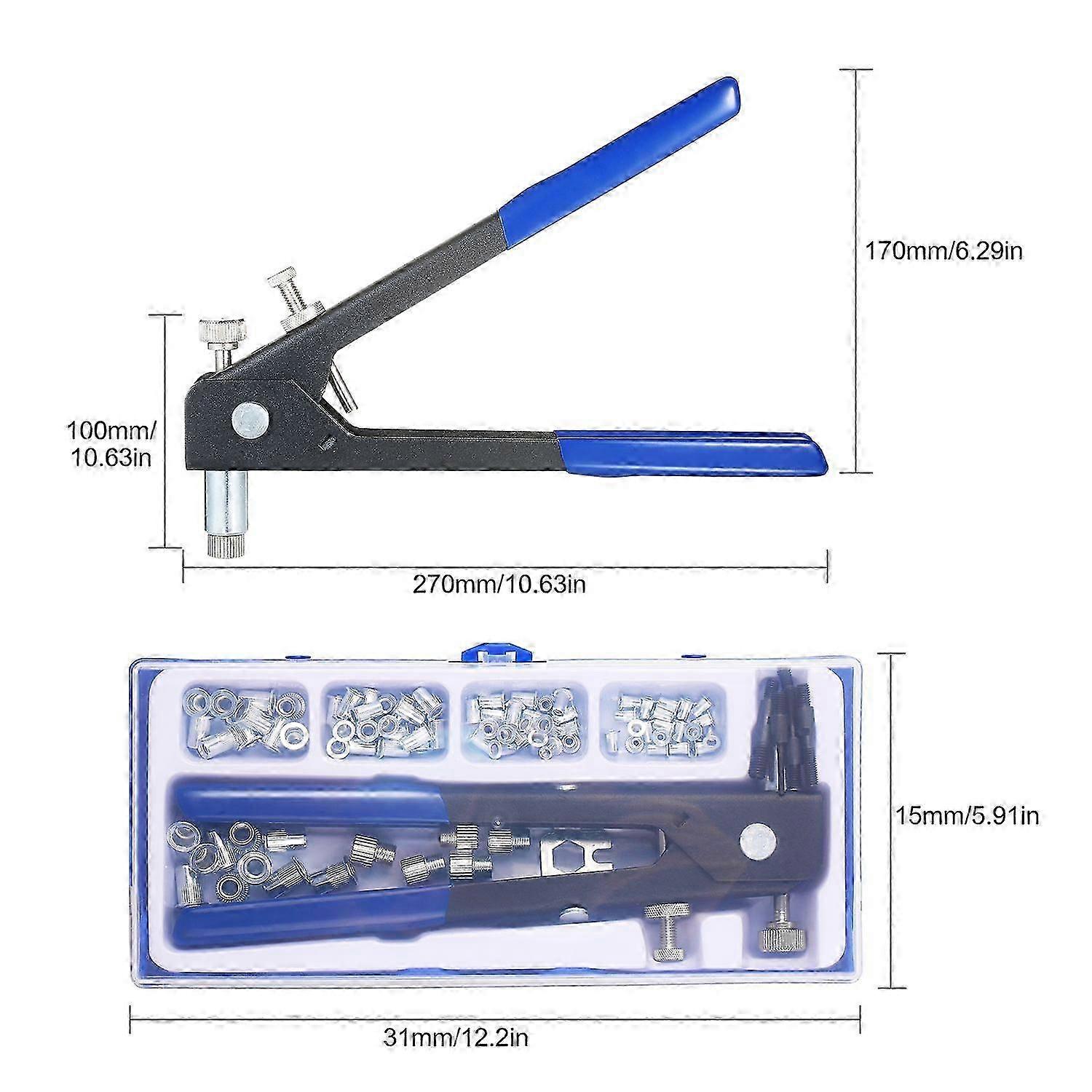 Feature:1. EASY TO OPERATION -- Just drill a hole in the workpiece, assemble the appropriate rivet nut onto the tool, insert it into hole, squeeze and then complete. Especially perfect when the surface in question is too thin to be tapped, or access to the backside is limited.2. ADVANTAGE DESIGN -- Tool with Mandrel Knob to help separate the rivet nut from riveter after it has been fixed; The Tool Stop Lever limits the opening of handles after the nut has expanded to prevent the thread of the nut from deformation.3. FULL SET -- 86PCS complete kit for more convenient use, with 5pcs Threaded Mandrels with nosepieces: M3/M4/M5/M6/M8, and 80pcs Rivet Nuts, M3(20pcs), M4(20pcs), M5(20pcs), M6(10pcs), M8(10pcs) to Meet Your Various Needs.4. PREMIUM QUALITY -- The Rivet nuts are made from aluminum alloy, they are High quality and reliable, with longer service time.5. VERSATILE RIVET NUT KIT SET -- This hand pull Blind nut rivet gun kit with 85 variouse size pieces, which is Perfect for car, trailers, furniture repair, even boat building etcs.Specification:Features:EASY TO -- Just drill a hole in the workpiece, assemble the appropriate rivet nut onto the tool, insert it into hole, squeeze and then complete. Especially perfect when the surface in question is too thin to be tapped, or access to the backside is limited.ADVANTAGE DESIGN -- Tool with Mandrel Knob to help separate the rivet nut from riveter after it has been fixed; The Tool Stop Lever limits the opening of handles after the nut has expanded to prevent the thread of the nut from deformation.FULL SET -- 86PCS complete kit for more convenient use, with 5pcs Threaded Mandrels with nosepieces: M3/M4/M5/M6/M8, and 80pcs Rivet Nuts, M3(20pcs), M4(20pcs), M5(20pcs), M6(10pcs), M8(10pcs) to Meet Your Various Needs.PREMIUM QUALITY -- The Rivet nuts are made from aluminum alloy, they are High quality and reliable, with longer service time.VERSATILE RIVET NUT KIT SET -- This hand pull Blind nut rivet gun kit with 85 variouse size pieces, which is Perfect for car, trailers, furniture repair, even boat building etcs.Specification:Color: Blue + BlackRiveter Body Material: Solid SteelRiveter Grip Handle Material: Solid Steel with blue PVC SleeveRivet Nut Material: Aluminum alloyMandrel Material: Solid SteelSize of Nut Rivet Mandrels: M3/M4/M5/M6/M8Riveter Size When Closed: 270 * 100mm / 10.63 * 3.94 inchCarrying Case Size: 310 * 150 * 40 mm / 12.2 * 5.91 * 1.57 inch (L x W x Thickness)Grip Range of Rivet Nuts:M3: for sheet with thickness from 0.5mm to 2mmM4: for sheet with thickness from 0.5mm to 2mmM5: for sheet with thickness from 0.5mm to 2.5mmM6: for sheet with thickness from 0.5mm to 3mmM8: for sheet with thickness from 0.5mm to 3.5mmPacking List:1 * Nut Riveter Tool20 * M3 Threaded Rivet Nut20 * M4 Threaded Rivet Nut20 * M5 Threaded Rivet Nut10 * M6 Threaded Rivet Nut10 * M8 Threaded Rivet Nut5 * Threaded Mandrels and Nosepieces: M3/M4/M5/M6/M81 * Plastic Storage Case1 * Instruction ManualPackage List:1 * Nut Riveter Tool20 * M3 Threaded Rivet Nut20 * M4 Threaded Rivet Nut20 * M5 Threaded Rivet Nut10 * M6 Threaded Rivet Nut10 * M8 Threaded Rivet Nut5 * Threaded Mandrels and Nosepieces: M3/M4/M5/M6/M81 * Plastic Storage Case1 * Instruction Manual