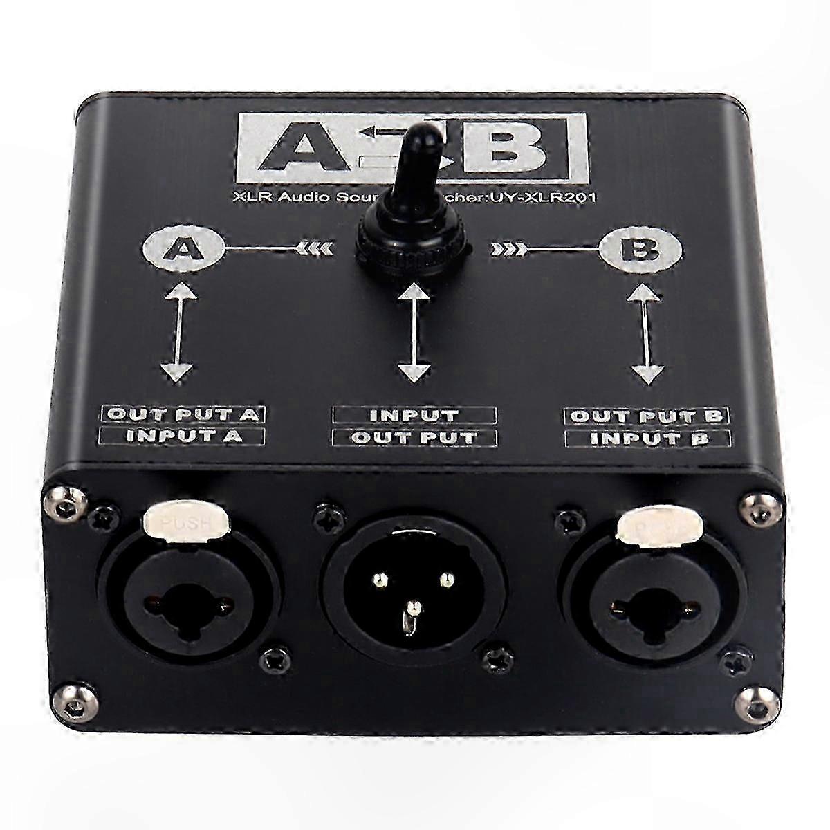 Usage Tips: Simple device with one input and two outputs, using a button switch to select which output receives the input signal. Passive design with all gold-plated XLR sockets. The switch is a single-pole double-throw XLR 123 pin. Optimized for noise-free switching with non-common ground design. Compact and intuitive condenser/dynamic microphone signal switcher. No power supply required. Can be used with audio sources such as computer mixers, sound cards, wireless microphones, or wired microphone output signals for seamless switching, including talkback applications. Quickly re-route your microphone signal—connect output A to the stage sound reinforcement system and output B to the internal communication bus. Zero latency, studio-grade balanced XLR output jacks enable lossless, fast, and reliable switching. Note: Condenser microphones require 48V phantom power; audible pop may occur when switching due to power impact. Interface: 1 male connector: XLR 2 female connectors: 6.5mm + XLR Color: Black Material: Aluminum Alloy Package Contents: 1 x Audio Switch Note: Light reflection and different display settings may cause slight color variations between the image and the actual item. Measurement error allowance: +/- 1-3 cm.