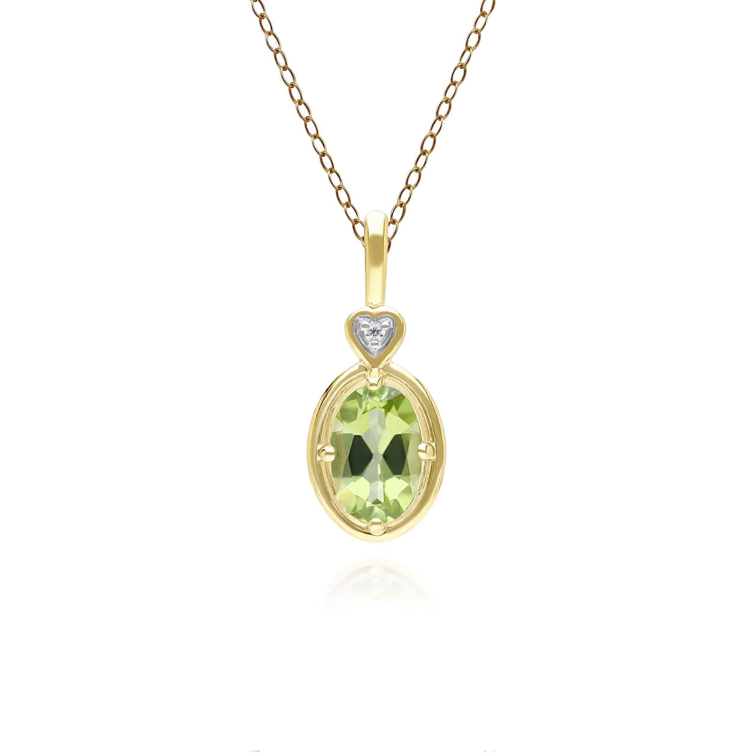 About This ItemAn Elegant Oval Peridot & Diamond Heart Pendant Necklace in 9ct Yellow Gold. Showcasing vibrant oval peridot stones accented by sparkling diamonds, this pendant exudes sophistication and charm. Set in warm 9ct yellow gold, its delicate heart design adds a refined touch, making it a perfect symbol of lasting luxury.Gemstone Information Peridot is a zesty gem with a vibrant green colour palette that can range from olive hues to darker bottle green shades. As a birthstone, peridot symbolism those born in August and is traditionally given as a 16th anniversary gift. Classic Collection Discover Gemondo's classic jewellery with a range of timeless designs set with natural gemstones. Find elegant gemstone rings and occasion jewellery pieces that never go out of style Product Code 135P2142039 Material 9ct Yellow Gold Gemstone Details 1 x Peridot - 0.517ct - Oval - 6x4mm, 1 x Diamond - 0.004ct - Round - 0.90mm Gemstone Origin Peridot - China, Diamond - India