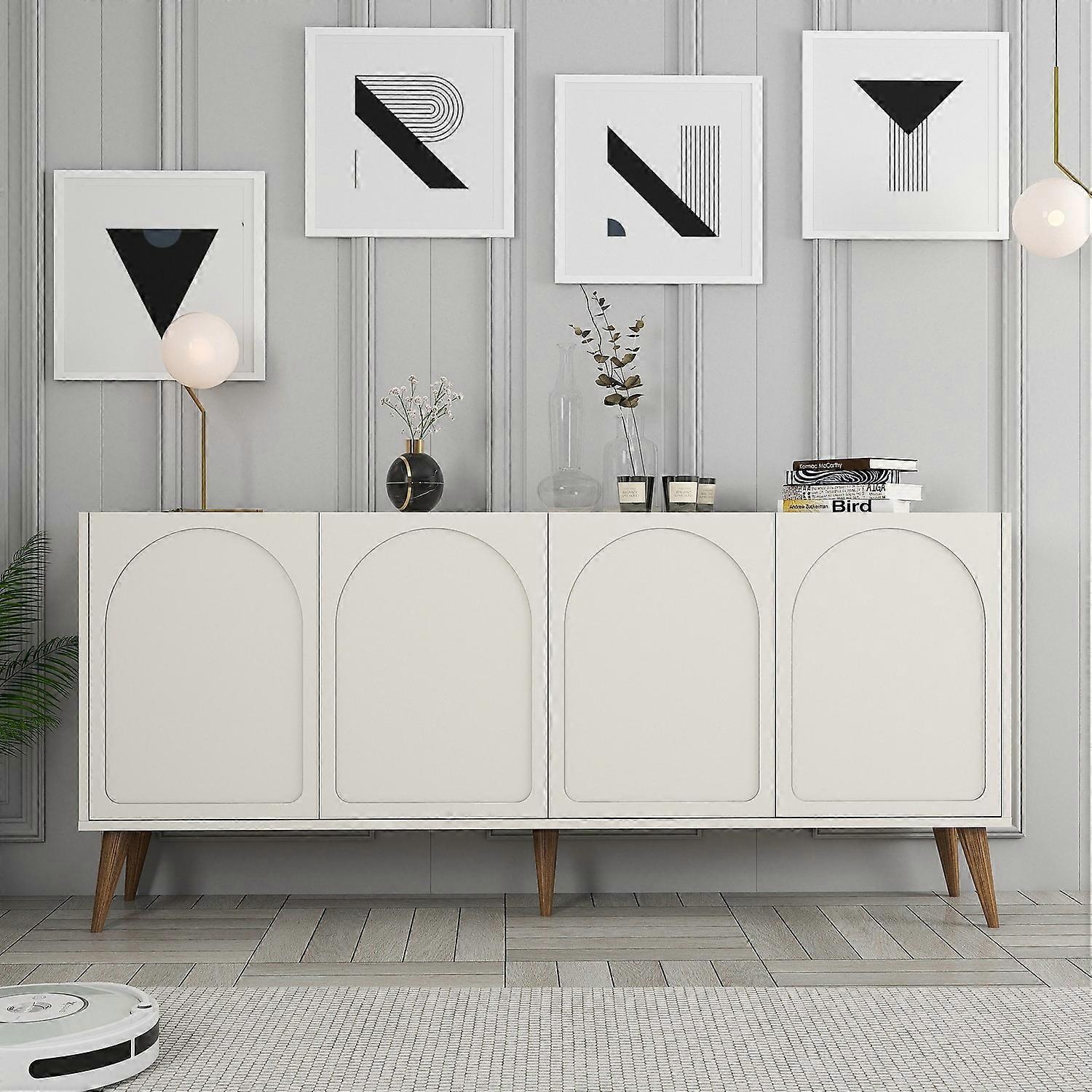 Förvandla ditt vardagsrum med vår fantastiska konsol, tillverkad av 100 % melaminbelagd spånskiva. Den eleganta designen och eleganta grädd- och valnötsfärgerna lyfter omedelbart utseendet på alla rum. Denna konsol är inte bara en möbel; det är ett uttalande av stil och sofistikering. Oavsett om du placerar den i ditt vardagsrum, hall eller entré kommer den att bli rummets fokuspunkt och imponera på dina gäster.