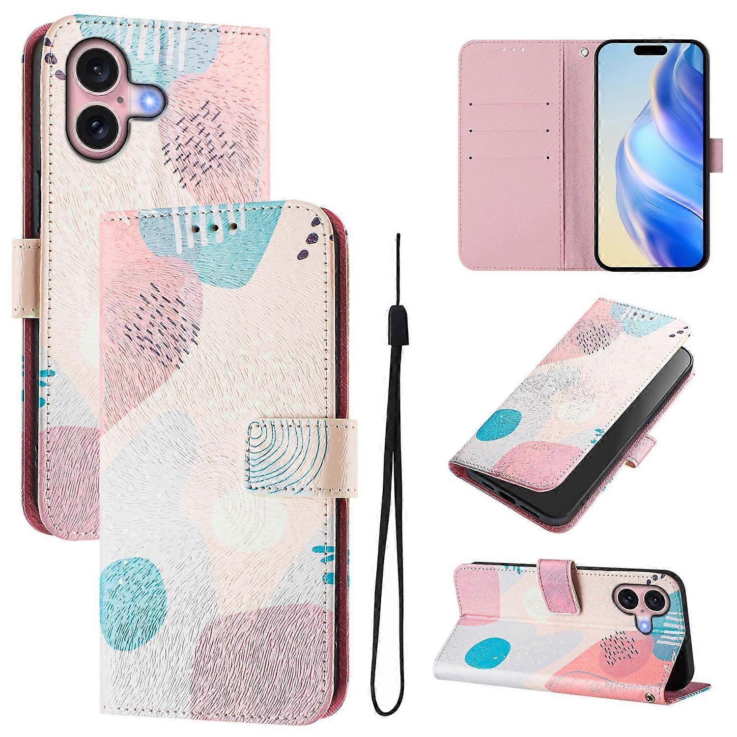 For iPhone 16 Case Pattern Printing Wallet Phone Cover with Strap - Graffiti