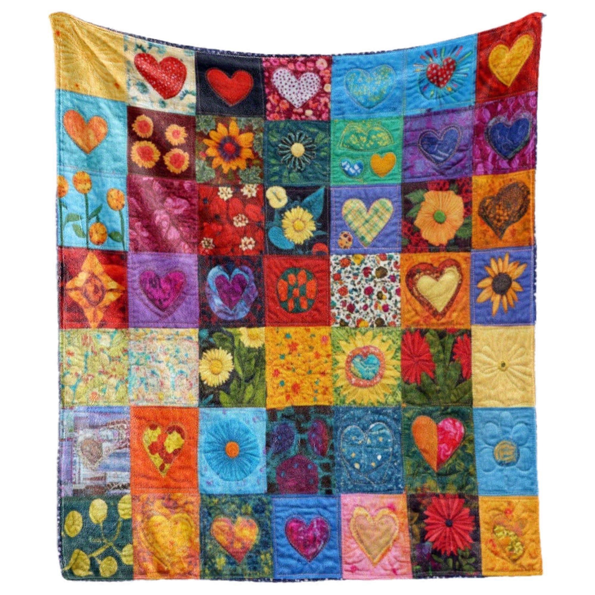Flannel Blanket - Multicolor Patchwork Hearts & Flowers Bedspread, Soft Minky-Like Texture All-Season Bed Cover, Quilt-l-dfghj218