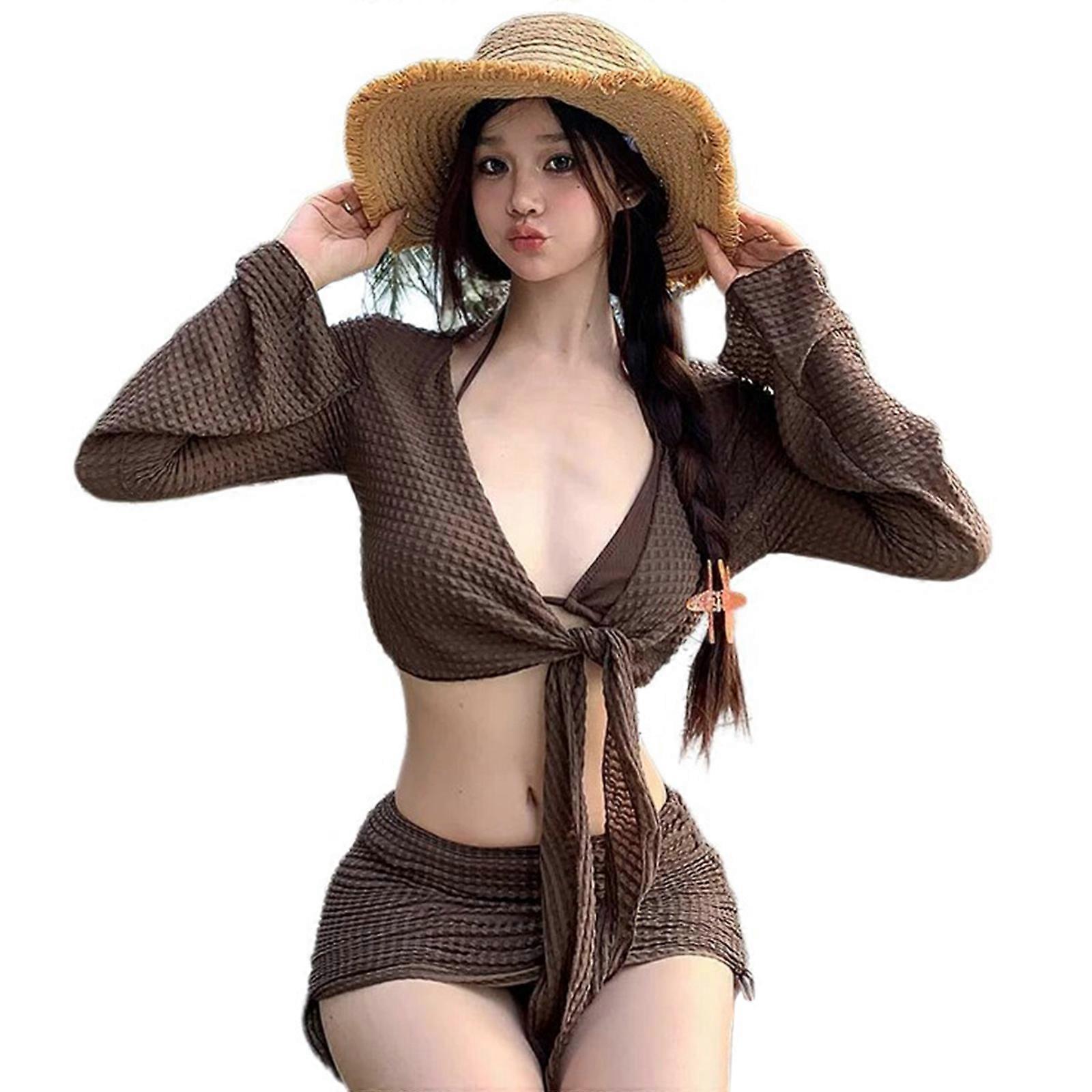 Women Bikinis Slender Beachwear Set Sexy Bathing Suit Cover Small Chest Wrap Gathered Swimming Bathing Suit with Coverup brown S