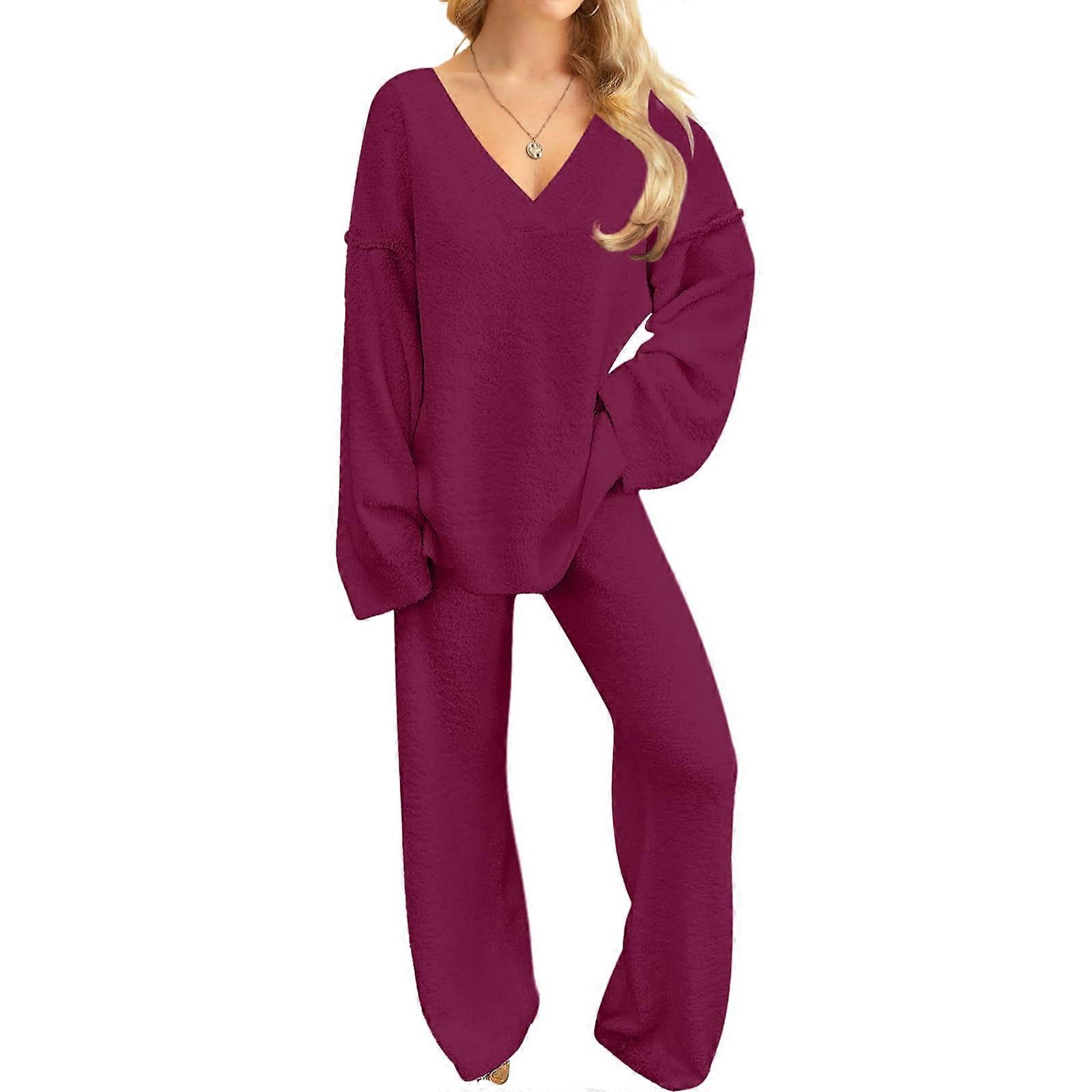 Women's casual suit autumn and winter fashion two-piece sweater pajamas set plush home clothes Burgundy XL