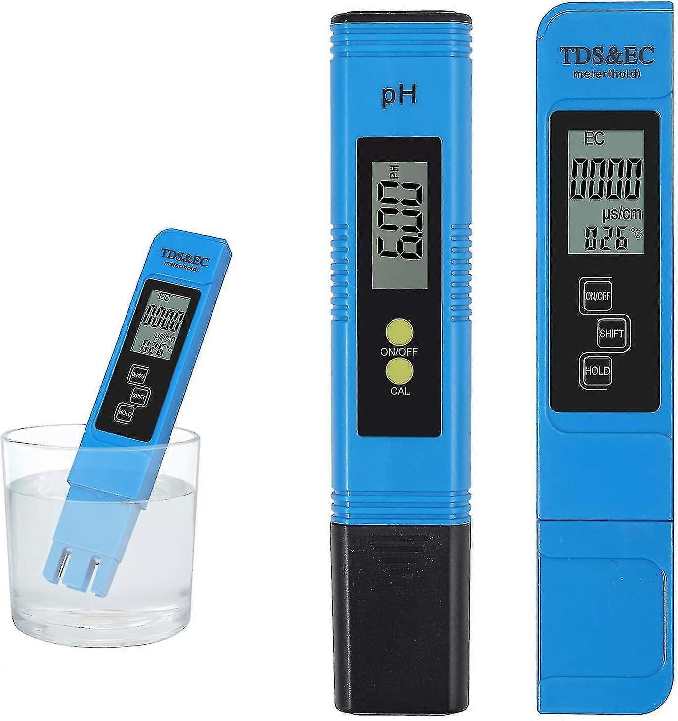 Easy to UseWhen testing liquids, you just need to look at the numbers on the meter's digital display, and you can know the TDS PH EC water temperature reading in 5 seconds, without compare with the test paper, which is more efficient and faster. TDS and EC testers measure total dissolved solids (TDS), electrical conductivity (EC) and temperature.Automatic humanized designAutomatic temperature compensation automatically takes into account temperature changes (0~80 degrees). The pH meter does not need to adjust the screwdriver, just use the automatic calibration button to complete the calibration, and comes with a buffer powder.[High precision] The digital range of the PH meter is 0.00 to 14.00 (PH), while the digital range of the EC and TDS digital meters is 0 to 9990 ppm. pH resolution 0.01pH, Accuracy 0.05pH.TDS: 0~9990ppm, Conductivity: 0~9990us/cm, Accuracy: 2%.[Wide Applications] Water Quality Tester ideal for drinking water, aquariums, fishing, swimming pools, RO systems, spas or hydroponics, student labs, tap water and any other liquid.