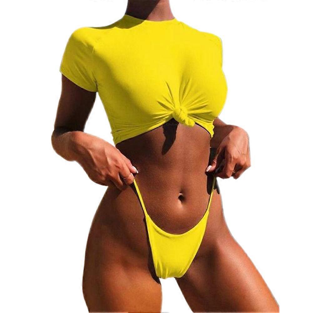 Women Two-piece Female Swimwear Bikini Short Sleeve Swimsuit Set (Yellow XL)
